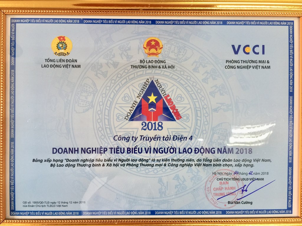 Bằng chứng nhận danh hiệu “ Vì người lao động Công ty Truyền tải điện 4 năm 2018 ”