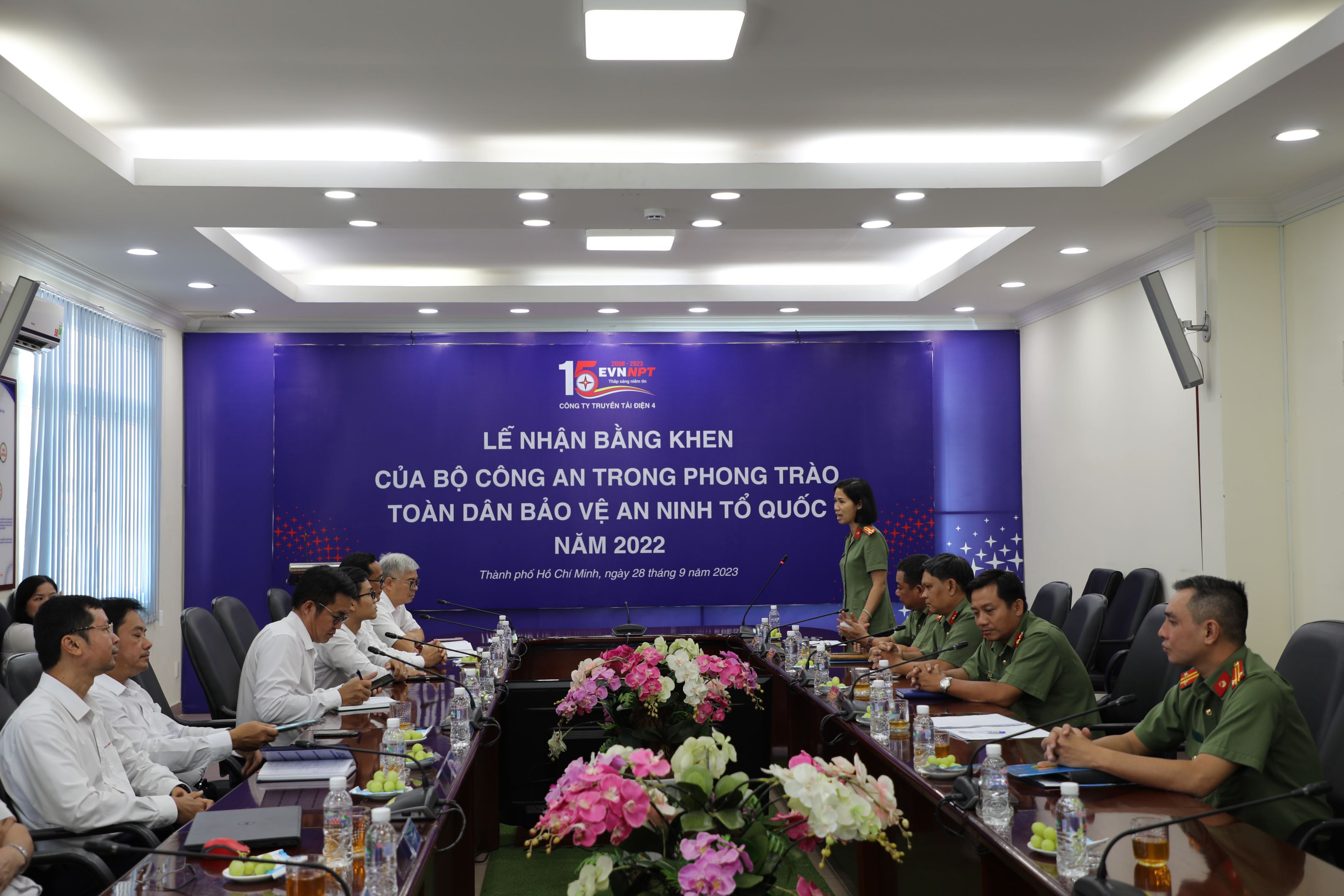 Phát biểu sau phần công bố và trao Quyết định, Bằng khen của Bộ Công an và Quyết định, công nhận của UBND Thành phố Hồ Chí Minh, Thượng tá Võ Thị Thúy Vinh - Phó Trưởng phòng An ninh Kinh tế chúc mừng những nỗ lực của cả tập thể PTC4 trong việc triển khai nhiều biện pháp, giải pháp, đồng lòng để đẩy mạnh phong trào Toàn dân bảo vệ an ninh Tổ quốc phù hợp với đặc thù và phát huy hiệu quả trong quản lý hệ thống lưới điện cao áp, cũng như xây dựng cơ quan, đơn vị an toàn về an ninh, trật tự năm 2022 theo Thông tư số 124/2021/TT-BCA ngày 28/12/2021 của Bộ Công an quy định về khu dân cư, xã, phường, thị trấn, cơ quan, doanh nghiệp, nhà trường đạt tiêu chuẩn "An toàn về an ninh, trật tự”. Đồng chí cũng đề nghị tập thể PTC4 tiếp tục phát huy những thành tích đã đạt được trong thực hiện nhiệm vụ năm 2023 và các năm tiếp theo, bám sát các quan điểm chỉ đạo trong Quy chế số 145/QCPH-CATP-TTĐ4 ngày 31/10/2022 về việc đảm bảo an ninh, an toàn Hệ thống Truyền tải điện 220 kV – 500 kV trên địa bàn Thành phố Hồ Chí Minh giữa Công an Thành phố và PTC4, bao gồm công tác sơ kết định kỳ hàng năm để kịp thời giải quyết các vấn đề nảy sinh phù hợp với diễn biến về an ninh trật tự, an toàn xã hội trên địa bàn./.