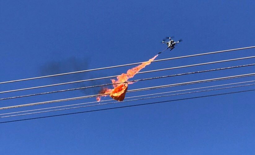 Điều khiển Flycam phun lửa đốt vật bay vướng vào đường dây