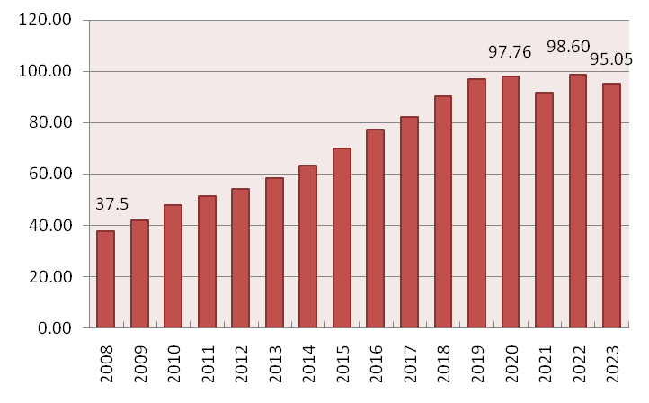 (Biểu đồ sản lượng điện truyền tải/năm của PTC4 trong 15 năm qua)