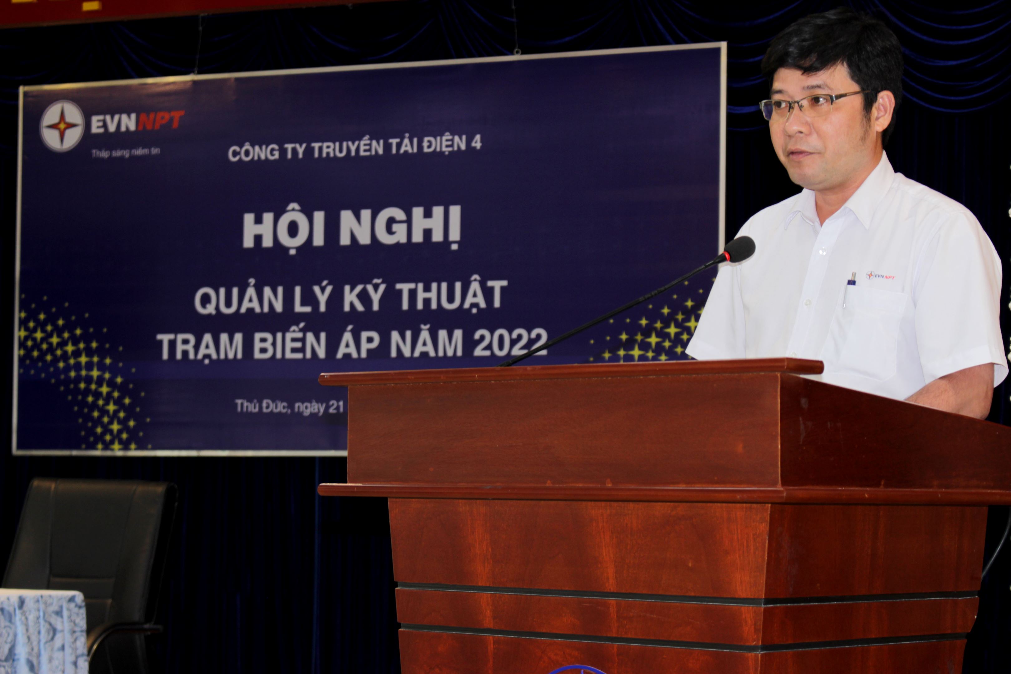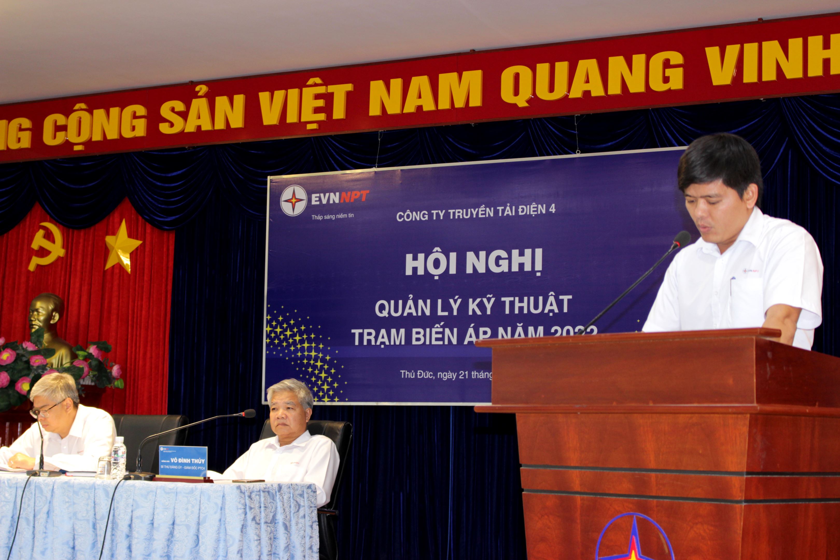 Tại Hội nghị, Ông Huỳnh Hữu Phúc, Trưởng phòng Kỹ thuật Công ty trình bày báo cáo tình hình sự cố trạm biến áp đến tháng 04/2022, phân tích nguyên nhân sự cố, đánh giá các nguy cơ sự cố. Hiện nay trong công tác quản lý kỹ thuật trạm biến áp tại Công ty Truyền tải điện 4 có các hạn chế là nguyên nhân của phần lớn các sự cố xảy ra trong những năm gần đây. Các hạn chế này cần được tập trung khắc phục để giảm sự cố. Các loại sự cố có nguy cơ lặp lại như sự cố do chim, Sự cố do nối đất không đạt yêu cầu kỹ thuật, sự cố nhị thứ…. Các tồn tại về quản lý kỹ thuật như hạn chế trong báo cáo thông tin sự cố, Tồn tại trong công tác xử lý phát nhiệt, Quản lý bản vẽ nhị thứ, Quản lý cấu hình rơ le..Qua đó đưa ra những giải pháp khắc phục như : Chống chim làm tổ, đuổi chim... Củng cố hệ thống nối đất: Chú trọng kiểm tra hệ thống nối đất trong khu vực thiết bị phân phối 22kV có các ngăn cung cấp cho các đường dây 22kV. Cáp ngầm là đối tượng có nguy cơ sự cố cao. Lưới nối đất khu vực này phải đảm bảo kết nối tốt để không xảy ra quá áp phóng điện ngược vào mạch nhị thứ. Ngăn ngừa sự cố nhị thứ, Củng cố công tác giám sát, nghiệm thu việc thí nghiệm nhị thứ, Kiểm soát phát nhiệt, Quản lý bản vẽ nhị thứ, Quản lý cấu hình rơ le, Diễn tập sự cố Các đơn vị khẩn trương củng cố công tác diễn tập sự cố, trong đó chú trọng các tình huống có nhiều thiết bị bị ảnh hưởng và tình huống yêu cầu truy xuất thông tin trong rơ le khi thiếu tín hiệu đèn sẵn có.