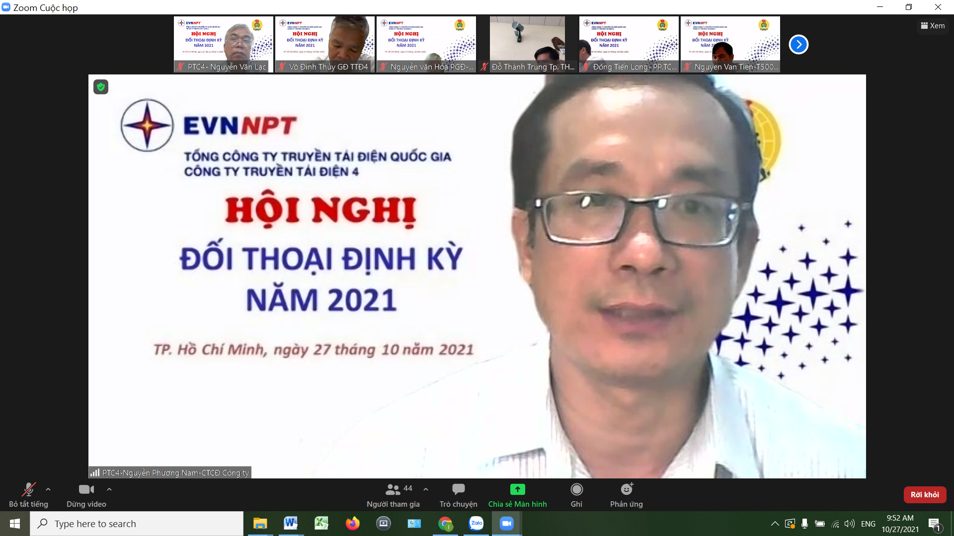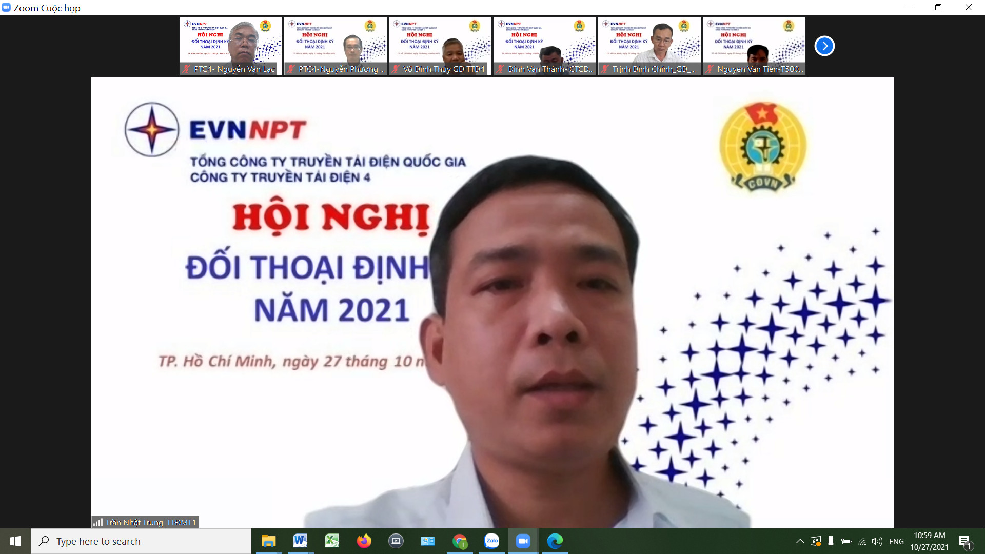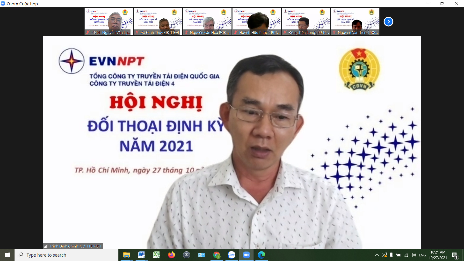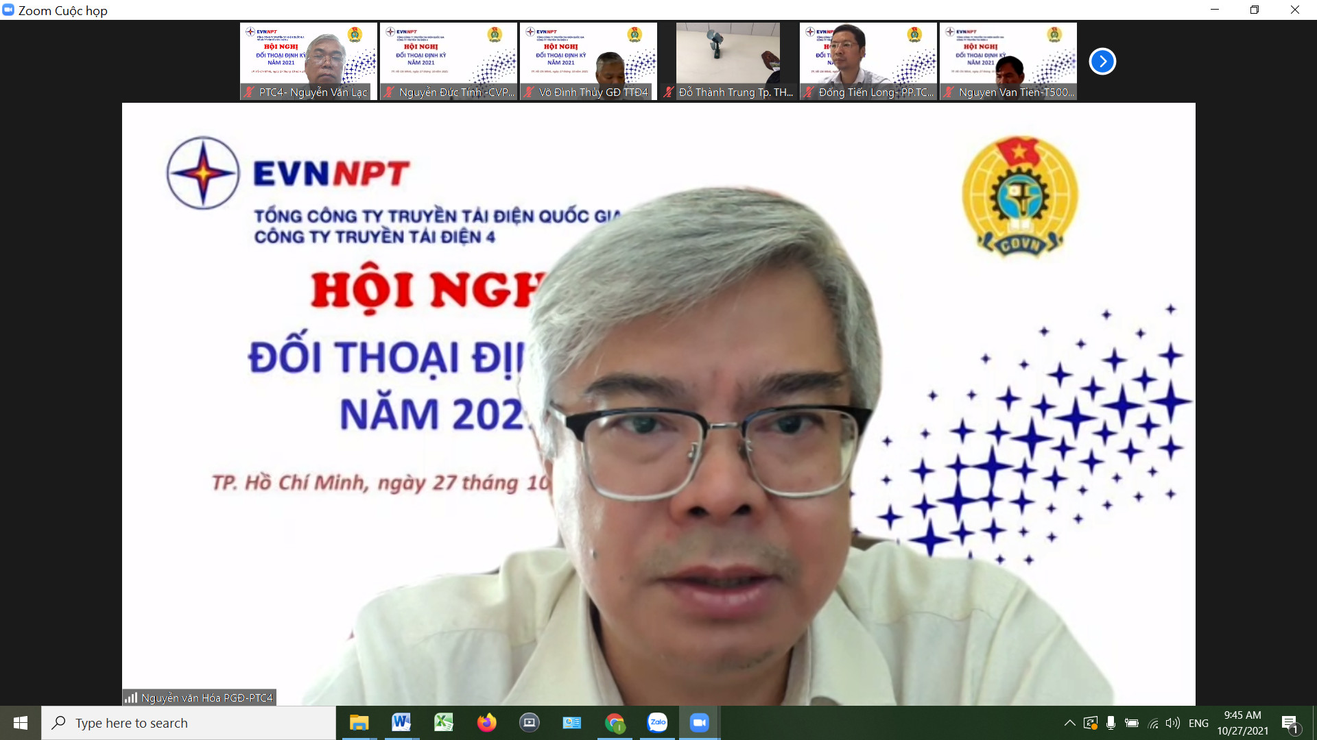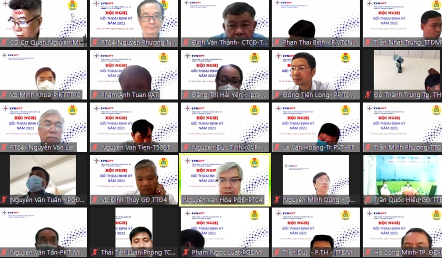 Nhằm phát huy quyền làm chủ của người lao động, chia sẻ thông tin, tham khảo, thảo luận, trao đổi ý kiến giữa người sử dụng lao động với người lao động về những vấn đề liên quan đến quyền, lợi ích và mối quan tâm của các bên tại nơi làm việc nhằm tăng cường sự hiểu biết, hợp tác, cùng nỗ lực hướng tới giải pháp các bên cùng có lợi, xây dựng quan hệ lao động hài hoà, ổn định và tiến bộ. Ngày 27/10/2021, Công ty Truyền tải điện 4 đã tổ chức Hội nghị đối thoại định kỳ tại nơi làm việc năm 2021 thông qua hình thức hội nghị trực tuyến.