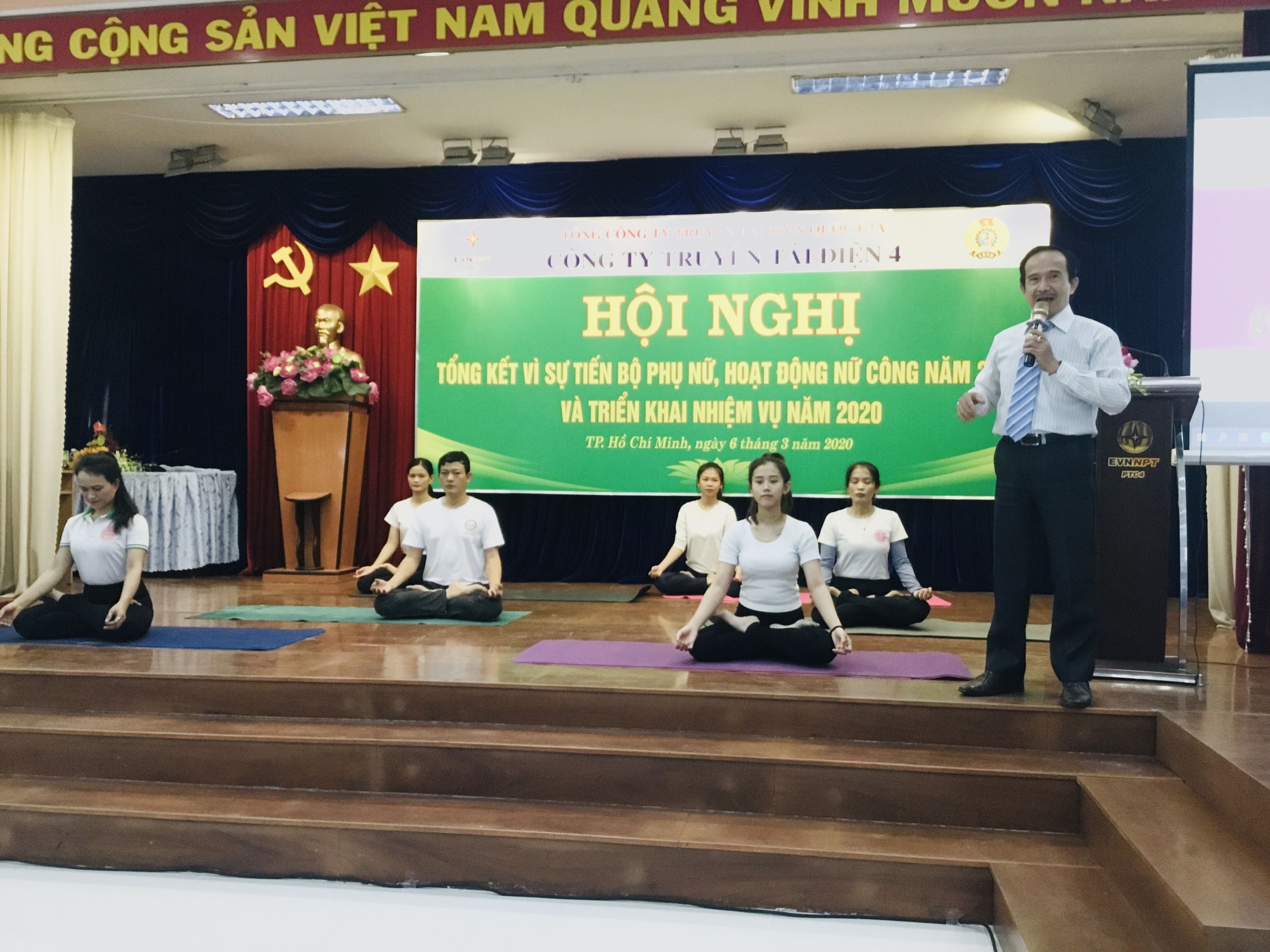 Sau phần Tổng kết Nữ công là phần nói chuyện chuyên đề về sức khỏe trong nữ CNVC Công ty. Thầy Nguyễn Văn Phương – Giám đốc Trung tâm đào tạo huấn luyện Yoga của Liên đoàn Yoga TPHCM đã hướng dẫn cho Nữ CNVC phương pháp tập yoga để tự rèn luyện sức khỏe bảo vệ bản thân và gia đình.