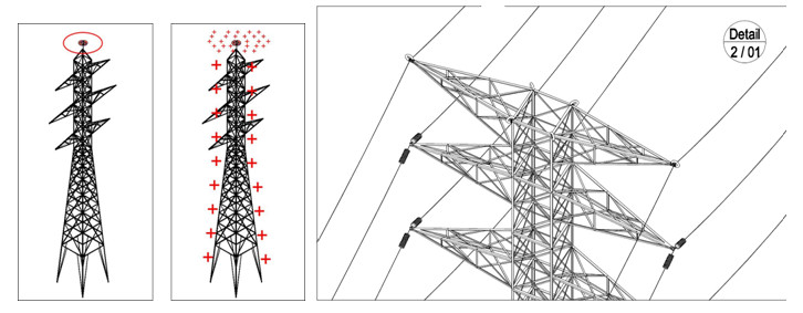 - Phương pháp mới – phân tán sét không cho sét đánh vào cột: Dựa trên nguyên lý ngăn ngừa sét đánh trực tiếp vào cột điện truyền tải, Hệ thống phân tán ngăn ngừa sét – Evodis® phân tán những điện tích trên trụ truyền tải thông qua hàng ngàn điểm nhọn và chặn sự tích tụ của những điện tích này trên đầu công trình. Quá trình này làm cho nơi được bảo vệ trở nên vô hình với sét, có khả năng ngăn sét đánh vào cột.