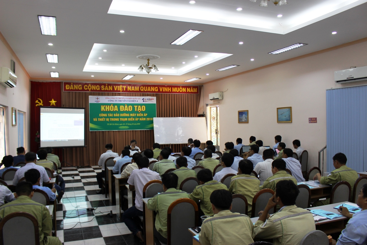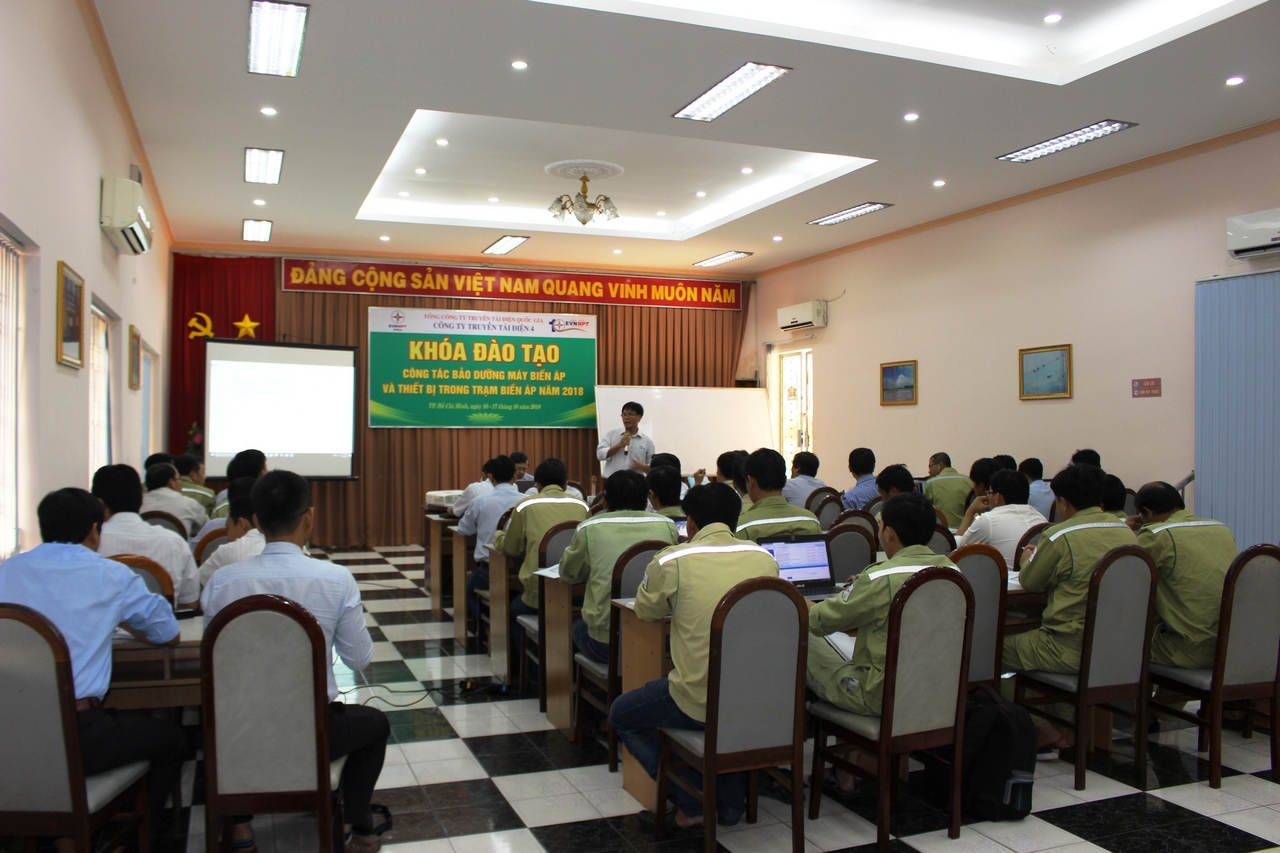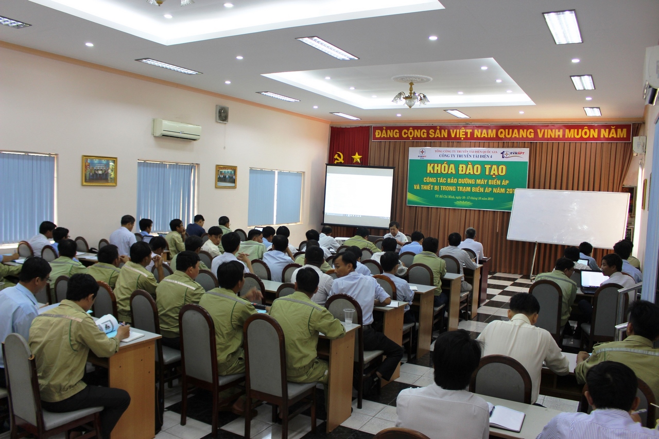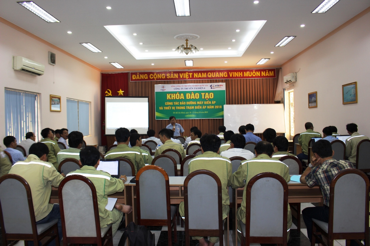 Công ty Truyền tải điện 4 đã tổ chức khóa đào tạo về bảo dưỡng máy biến áp và các thiết bị trong trạm biến áp trong 06 ngày, chia làm 2 đợt từ ngày 10/10 đến ngày 17/10/2018 tại Hội trường Công ty Truyền tải điện 4. Khóa học được các chuyên viên nhiều kinh nghiệm thuộc phòng Kỹ thuật Công ty hướng dẫn.