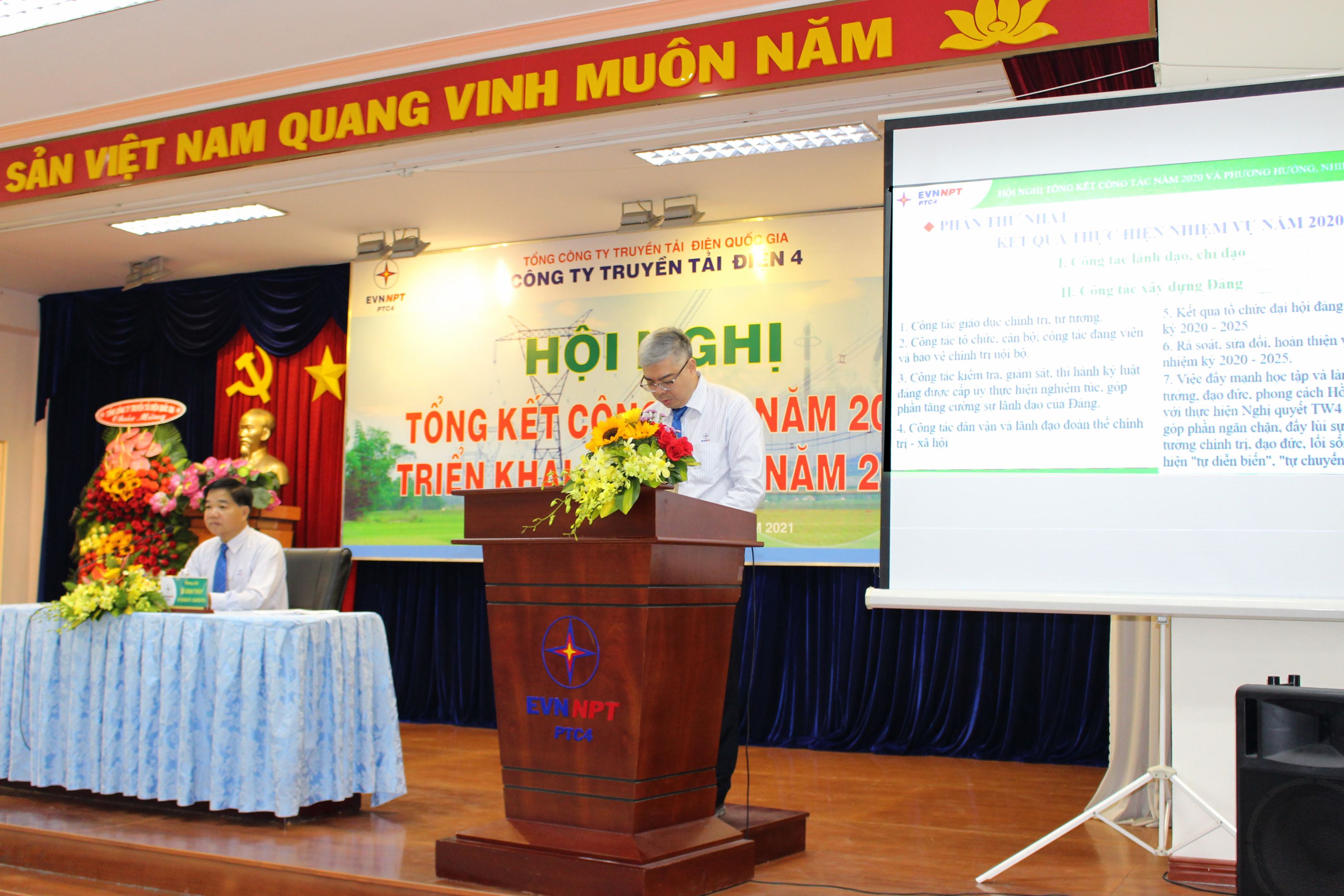 Thay mặt PTC4, đ/c Nguyễn Văn Hóa, Phó bí thư Đảng ủy, Phó Giám đốc Công ty báo cáo: Năm 2020, dưới sự lãnh đạo, chỉ đạo của Đảng ủy Tổng công ty, Đảng ủy PTC4 đã xây dựng Chương trình công tác của Ban chấp hành Đảng bộ năm 2020. Xây dựng, ban hành và triển khai thực hiện Nghị quyết công tác năm 2020 và 02 nghị quyết chuyên đề về lãnh đạo công tác quốc phòng - quân sự và phòng chống khủng bố, về tăng cường lãnh đạo công tác chính trị tư tưởng; 04 Kế hoạch về công tác tuyên truyền đại hội đảng bộ các cấp tiến tới Đại hội Đại biểu toàn quốc lần thứ XIII của Đảng; Chương trình kiểm tra, giám sát toàn khóa và năm 2020 của Đảng ủy và của UBKT Đảng ủy Công ty ngay sau Đại hội đại biểu Đảng bộ Công ty nhiệm kỳ 2020 – 2025; ban hành các Chương trình hành động thực hiện các Nghị quyết của Đảng ủy Tập đoàn và Đảng ủy Tổng công ty, tạo tiền đề để Đảng ủy Công ty chủ động, kịp thời tổ chức thực hiện có hiệu quả các chủ trương, nghị quyết của Trung ương và Đảng ủy cấp trên, hoàn thành tốt nhiệm vụ chính trị, công tác xây dựng Đảng và lãnh đạo các đoàn thể.