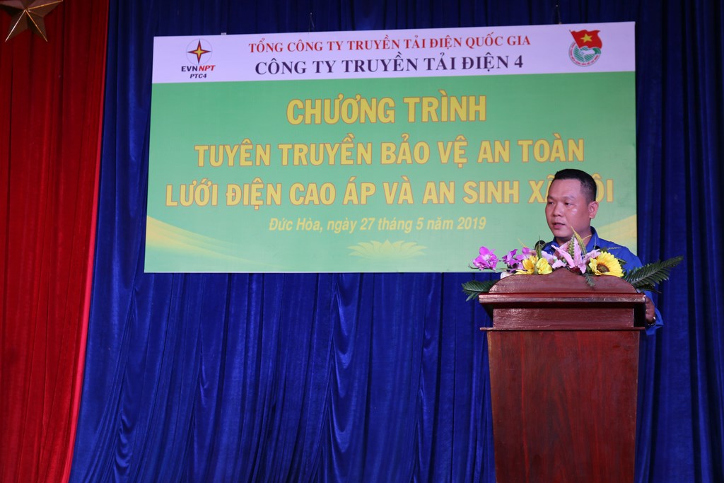 Mở đầu chương trình, ông Nguyễn Trung Khoa – Bí thư Đoàn thanh niên PTC4 đã có những phát biểu chia sẻ: “Thông qua việc tổ chức chương trình lần này, Đoàn thanh niên Công ty Truyền tải điện 4 mong muốn tuyên truyền đến toàn thể bà con nhân dân tại địa phương hiểu được chức năng, nhiệm vụ, vai trò của Tổng công ty Truyền tải điện Quốc gia (EVNNPT) nói chung, Công ty Truyền tải điện 4 (PTC4) nói riêng, từ đó tạo sự đồng thuận, chia sẻ và ủng hộ của toàn xã hội đối với các công việc mà EVNNPT,cũng như các đơn vị quản lý dự án, quản lý vận hành đang thực hiện. Bênh cạnh đó, việc kết hợp tổ chức các hoạt động an sinh xã hội, tặng quà cho học sinh nghèo, gia đình có hoàn cảnh khó khăn, với mong muốn hỗ trợ, góp một phần nhỏ trong công tác chăm lo đời sống cho người dân tại địa phương, qua đó khẳng định sự quan tâm của lãnh đạo, sự tương thân tương ái của CBCNV Công ty Truyền tải điện 4 đối với nhân dân huyện Đức Hòa, tỉnh Long An, nơi có lưới truyền tải điện đi qua, góp phần làm đẹp hình ảnh ngành điện trong nhận thức của bà con nhân dân tại địa phương”.