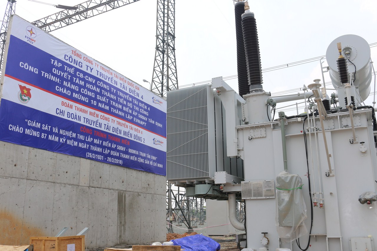 Công trình “Nâng công suất trạm 500kV Tân Định” bao gồm các hạng mục như sau: Thay MBA-AT2 500kV từ 450MVA lên 900MVA, chuyển ngăn lộ tự dùng phía 35kV của MBA-AT2 sang dùng phía 22kV của MBA-AT3, xây dựng mới ngăn lộ kết giàn 212 thanh cái C21, C22, cải tạo ngăn lộ 200 chỉ dùng cho thay thế MC ngăn lộ, thay dây dẫn thanh cái C21, C22 từ 02 dây 885mm2 lên 3 dây 885mm2, thay thế thiết bị ngăn lộ 232, 200 với dòng ngắn mạch từ 40kA lên 63kA, lắp đặt Kháng hạn dòng trên thanh cái C21, C22, Kháng hạn dòng 22kV phía tự dùng 22kV của MBA-AT3, tháo gỡ MBA-AT5.