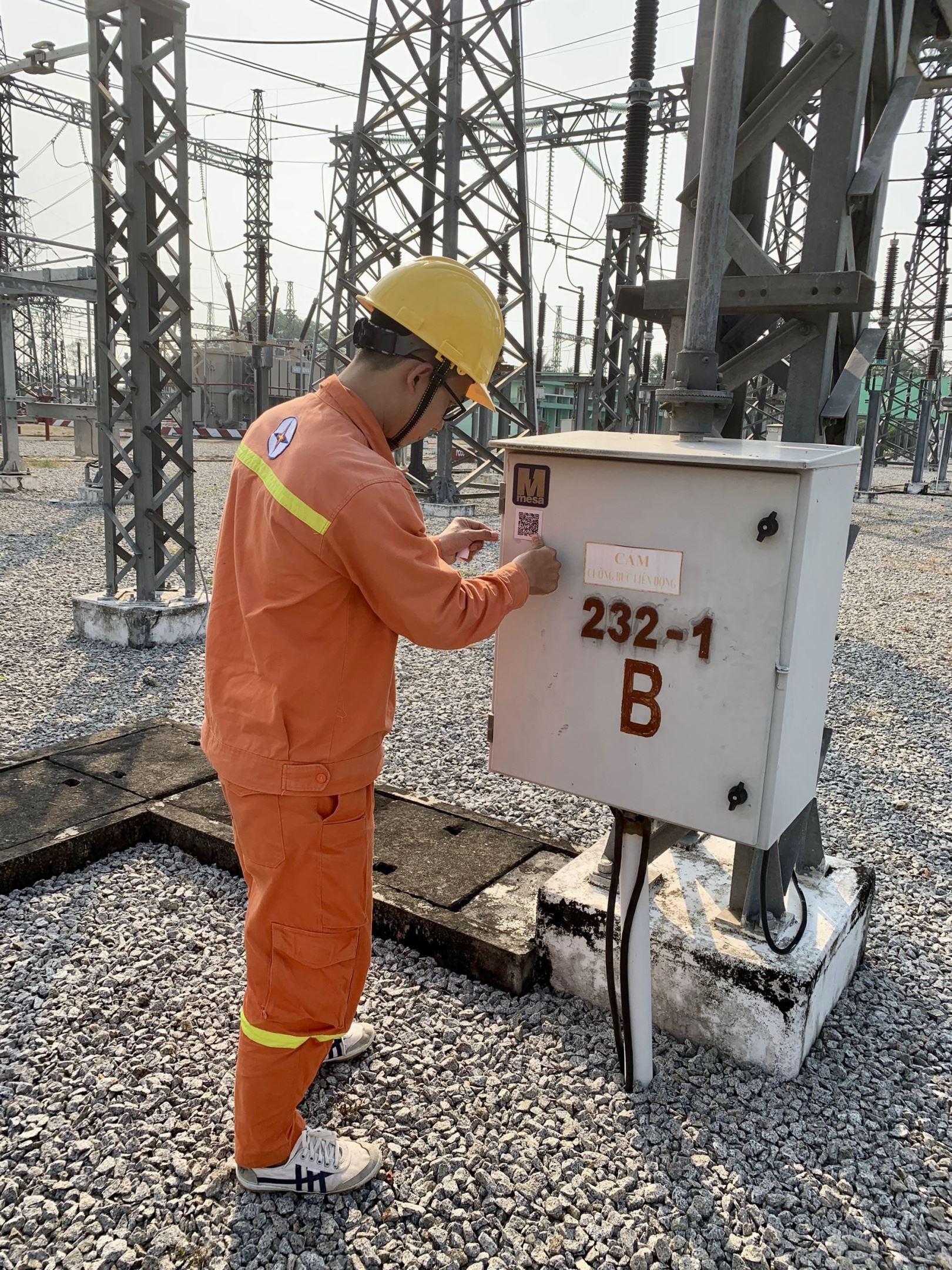 Đoàn viên thanh niên Trạm 220kV Rạch Giá tiến hành dán mã QR code lên thiết bị điều khiển, nhà Bay.