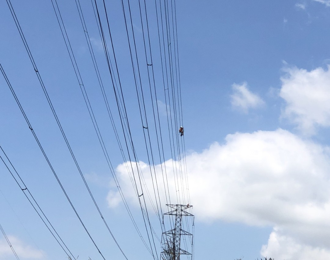 Công nhân Đội TTĐ Cai Lậy thực hiện ra dây dẫn treo puly trên dây pha trên cùng tại khoảng cột 31-32 để cố định dây chống sét không bị chùng xuống khi kéo và không bị bay qua mạch bên cạnh còn đang mang điện.
