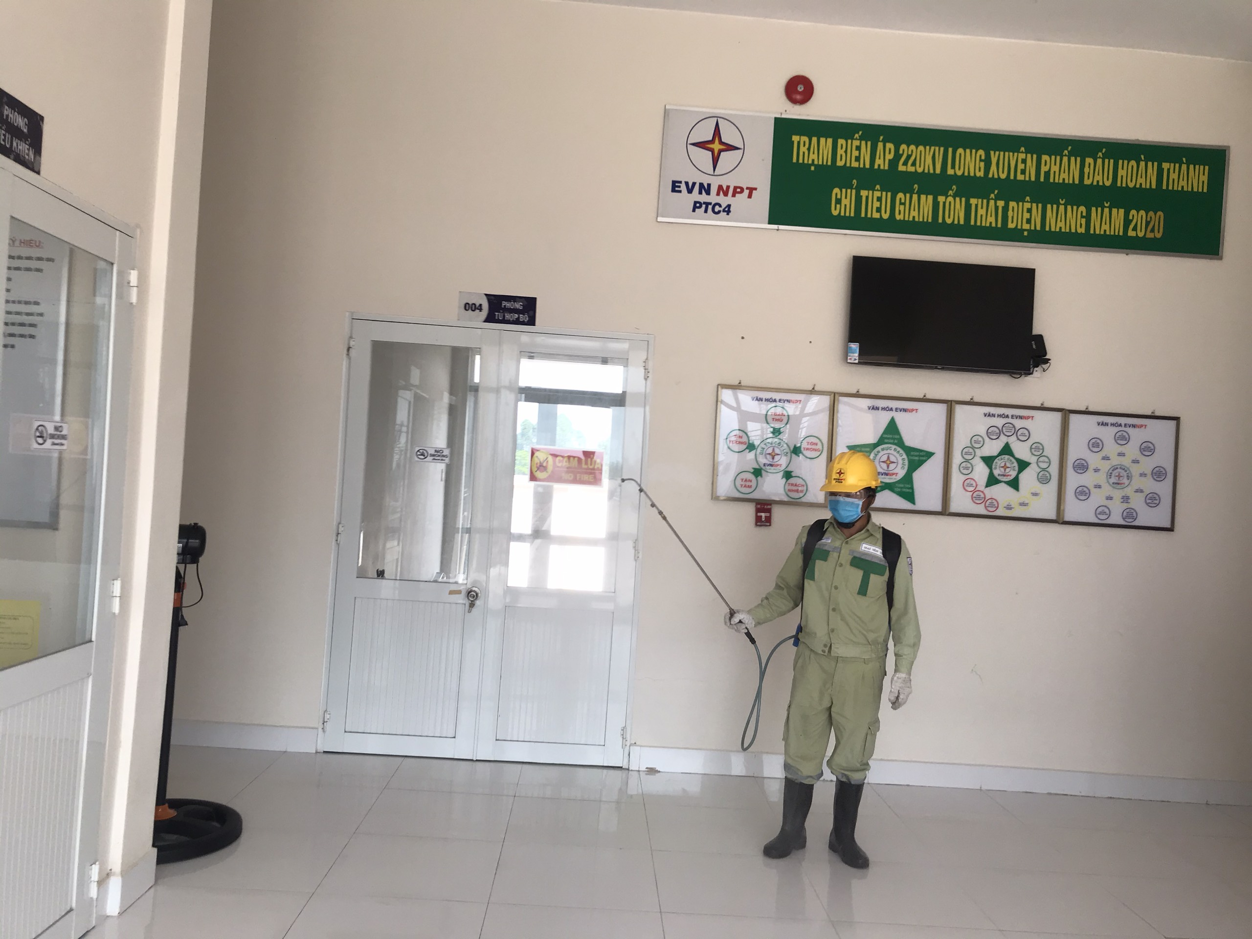 Điều hành viên Trạm 220 kV Châu Đốc phun thuốc khử trùng trong trạm.