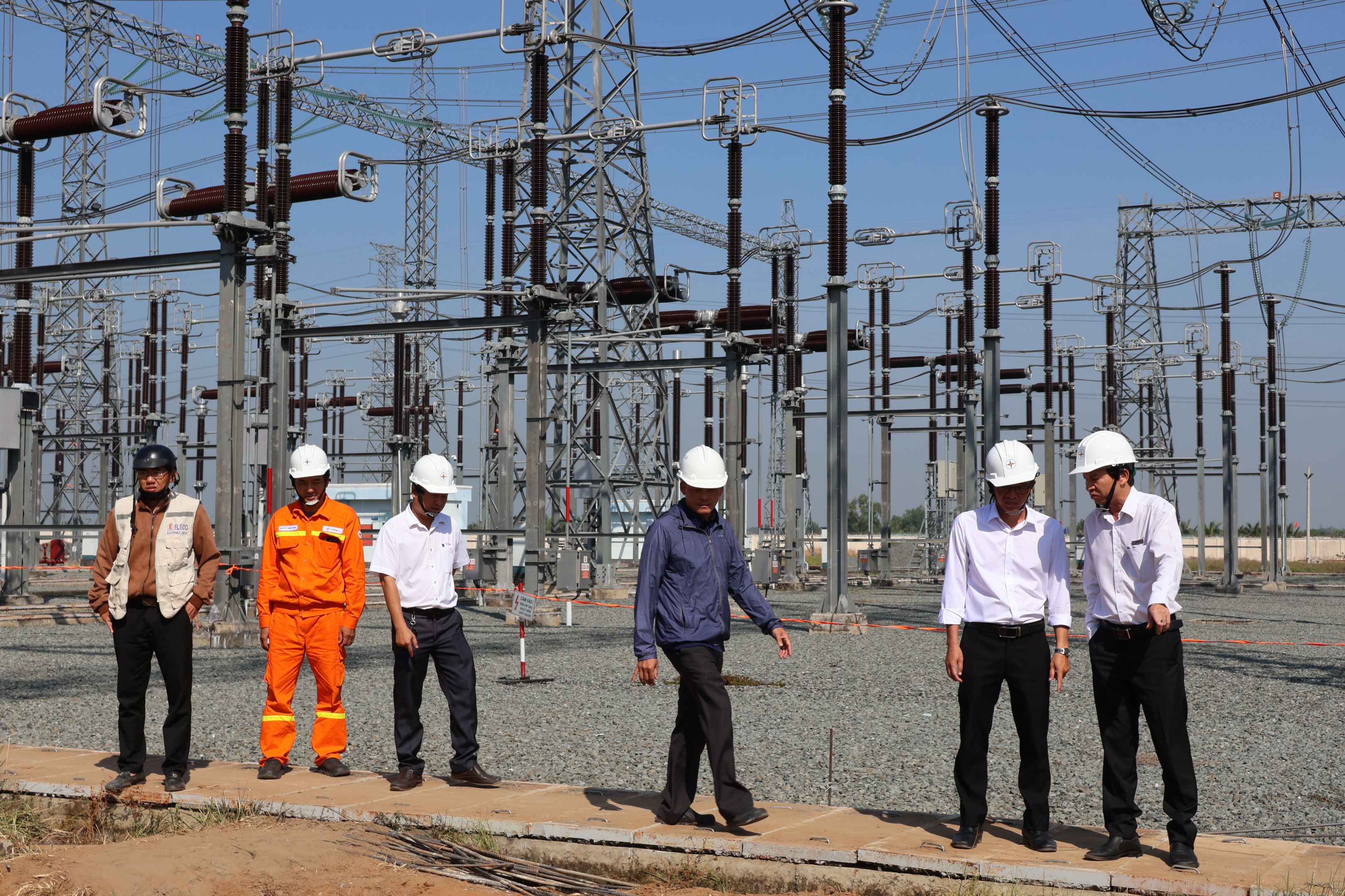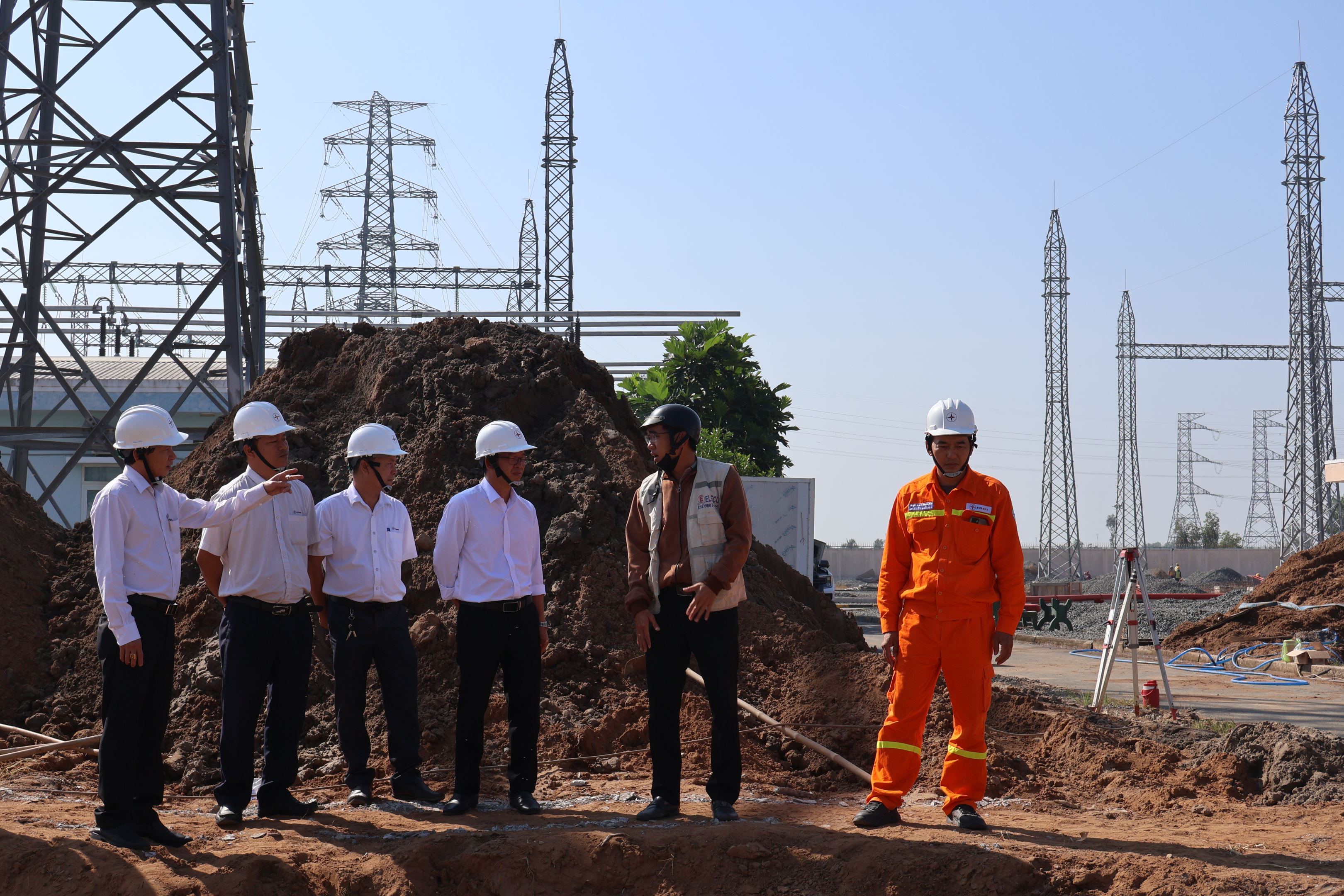 Ông Nguyễn Duy Trung - Đội trưởng Đội TTĐ Tây Ninh ( người đứng bên trái ngoài cùng) kiểm tra công tác thi công phần xây dựng lắp MBA 220kV.