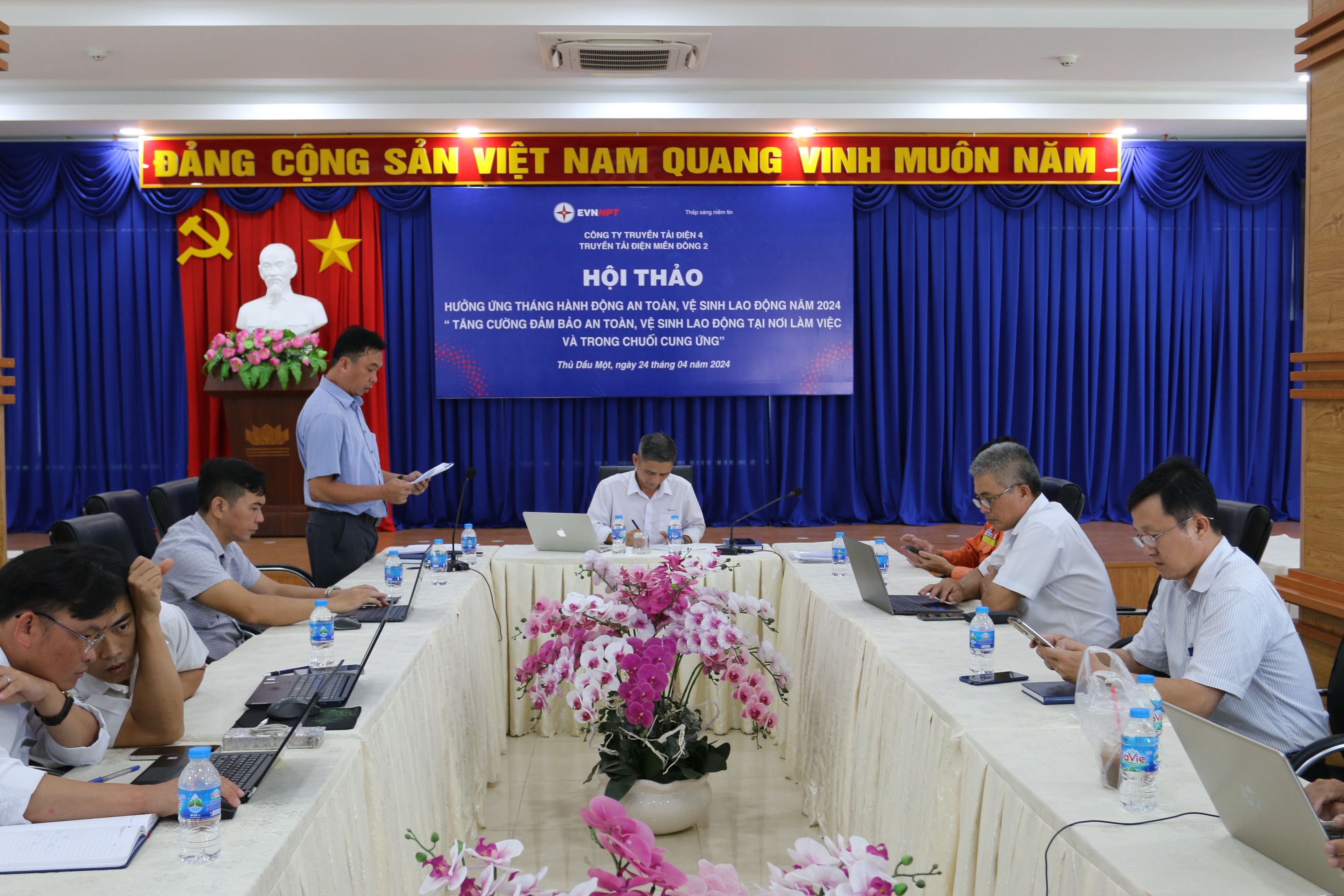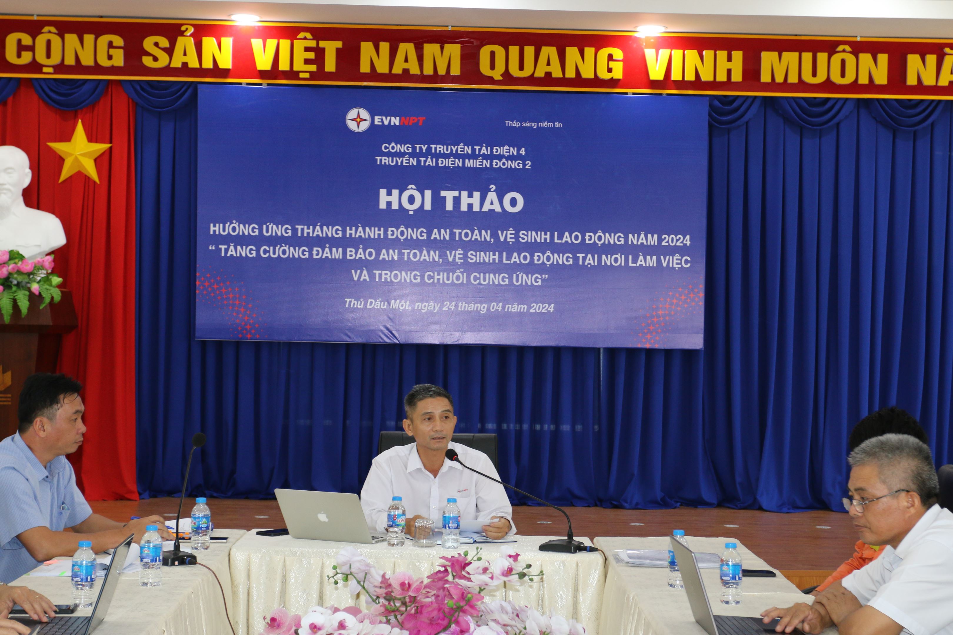 Phát biểu kết luận tại hội thảo ông Nguyễn Văn Lịch - Phó giám đốc, Chủ tịch Công đoàn Truyền tải điện miền Đông 2 cần đẩy mạnh công tác thông tin, tuyên truyền, nâng cao ý thức, nhận thức cho người sử dụng lao động, lãnh đạo các Truyền tải điện, tổ, đội, trạm, Tổ thao tác lưu động, lãnh đạo các phòng và người lao động trong việc thực hiện Luật An toàn, vệ sinh lao động, các quy định, chỉ đạo về công tác An toàn, vệ sinh lao động. Tuân thủ các giải pháp đảm bảo về an toàn giao thông. Tạo cao điểm về các hoạt động truyền thông, nâng cao nhận thức và sự tuân thủ pháp luật về an toàn, vệ sinh lao động, đồng thời thúc đẩy các chương trình hành động cụ thể về ATVSLĐ và triển khai chủ đề của Tháng hành động ATVSLĐ năm 2024. là: “Tăng cường đảm bảo an toàn, vệ sinh lao động tại nơi làm việc và trong chuỗi cung ứng”; biên soạn, trinh duyệt quy trình vận hành thiết bị, dụng cụ an toàn, dụng cụ thi công, huấn luyện, sát hah người lao động sư dụng thành thục dụng cụ an toàn, dụng cụ thi công. Trước khi tiến hành công việc cần thực hiện nhận diện, đánh giá rủi ro và đề ra các giải pháp kiểm soát yếu tố nguy hiểm, rủi ro về an toàn lao động tại khu vực làm việc theo quyết định theo Quyết định số 1764/ QĐ - EVNNPT ngày 28/12/2021, phổ biến đến tất cả người lao động trước khi bắt đầu làm việc. Đặc biệt là các ATVSV tại các Đội, Trạm cần phát huy vai trò của mình hơn nữa, chủ động trong công tác kiểm tra an toàn lao động tại đơn vị mình, kịp thời nhắc nhở, phát hiện sai sót an toàn lao động trong quá trình công tác. Tuân thủ các giải pháp đảm bảo về an toàn giao thông, đảm bảo tuyệt đối cho CBCNV tại đơn vị. Trong quá trình công tác ngoài hiện trường, các đơn vị phải lưu ý các vấn đề an toàn lao động; phải tổ chức phổ biến và ký cam kết đảm bảo ATVSLĐ đối với người lao động tham gia công tác; khi làm việc trên cao phải móc dây an toàn vào vị trí cố định, chắc chắn, người chỉ huy trực tiếp phải giám sát thao tác của người làm việc trên cao để kịp thời nhắc nhở; khi làm việc trên máy biến áp, trên gàu của xe cẩu phải sử dụng dây an toàn. Tuyệt đối tuân quy định thử đèn trước khi tiếp địa, sử dụng đầy đủ tiếp địa chặn cả 03 pha, tiếp địa cảm ứng tại vị trí công tác; Chấn chỉnh việc thực hiện các thủ tục cho phép làm việc, tiếp nhận hiện trường, người cho phép , người chỉ huy trực tiếp kiểm tra, thực hiện đầy đủ các biện pháp an toàn tại hiện trường mới được phép bàn giao, tiếp nhận hiện trường công tác; Thực hiện lập sổ theo dõi trước, trong và sau khi mỗi đợt công tác đối với các thiết bị có yêu cầu nghiêm ngặt về an toàn lao động, thử nghiệm các dụng cụ thi công, dụng cụ an toàn, thiết bị có yêu cầu nghiêm nghặt về ATLĐ đầy đủ theo quy định của Công ty, lập biên bản kiểm tra dụng cụ, thiết bị trước khi đưa ra công trường sử dụng.