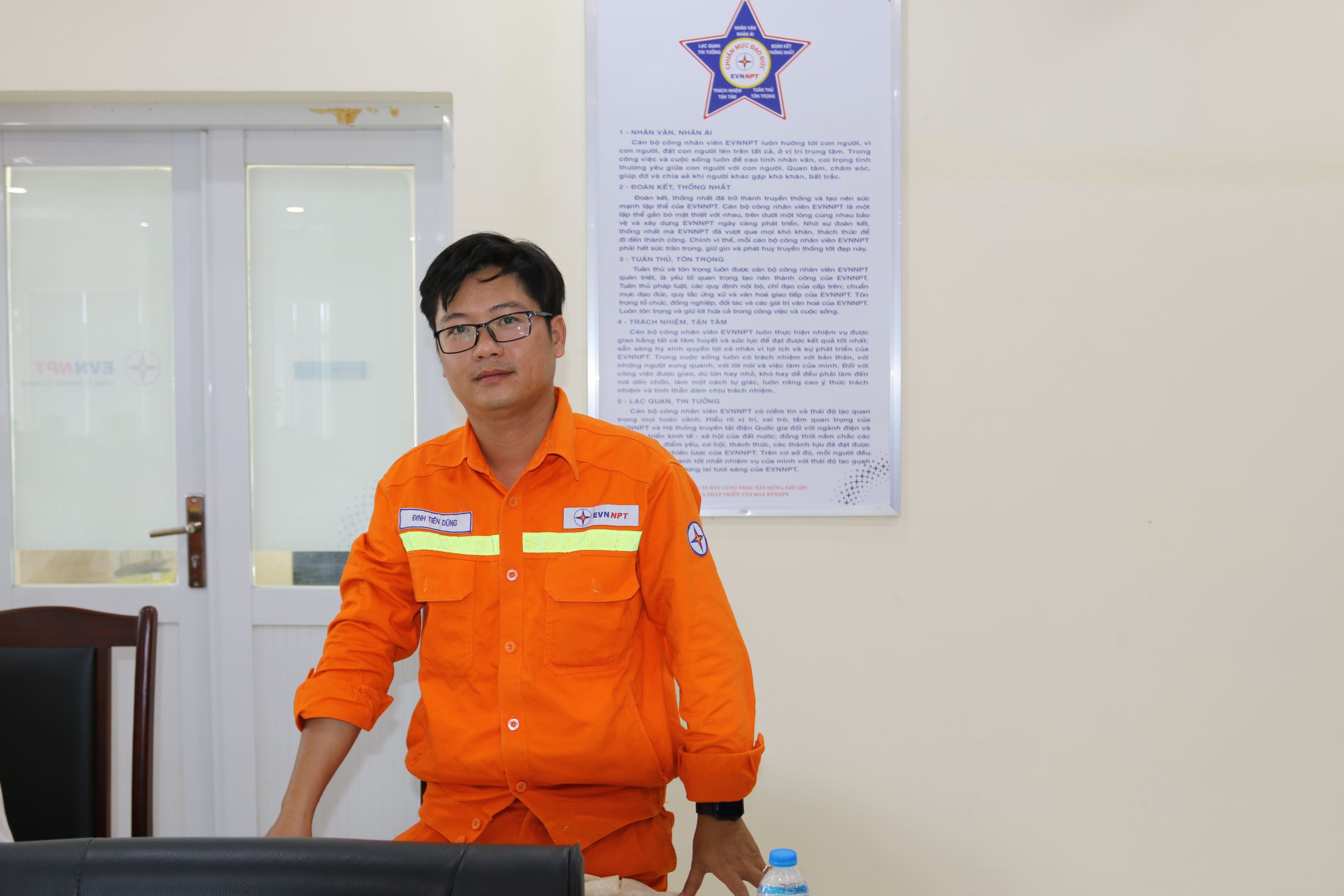 Anh Đinh Tiến Dũng - An toàn vệ sinh viên Đội Truyền tải điện Bù Đăng trao đổi một số khó khăn trong công tác an toàn, vệ sinh lao động.