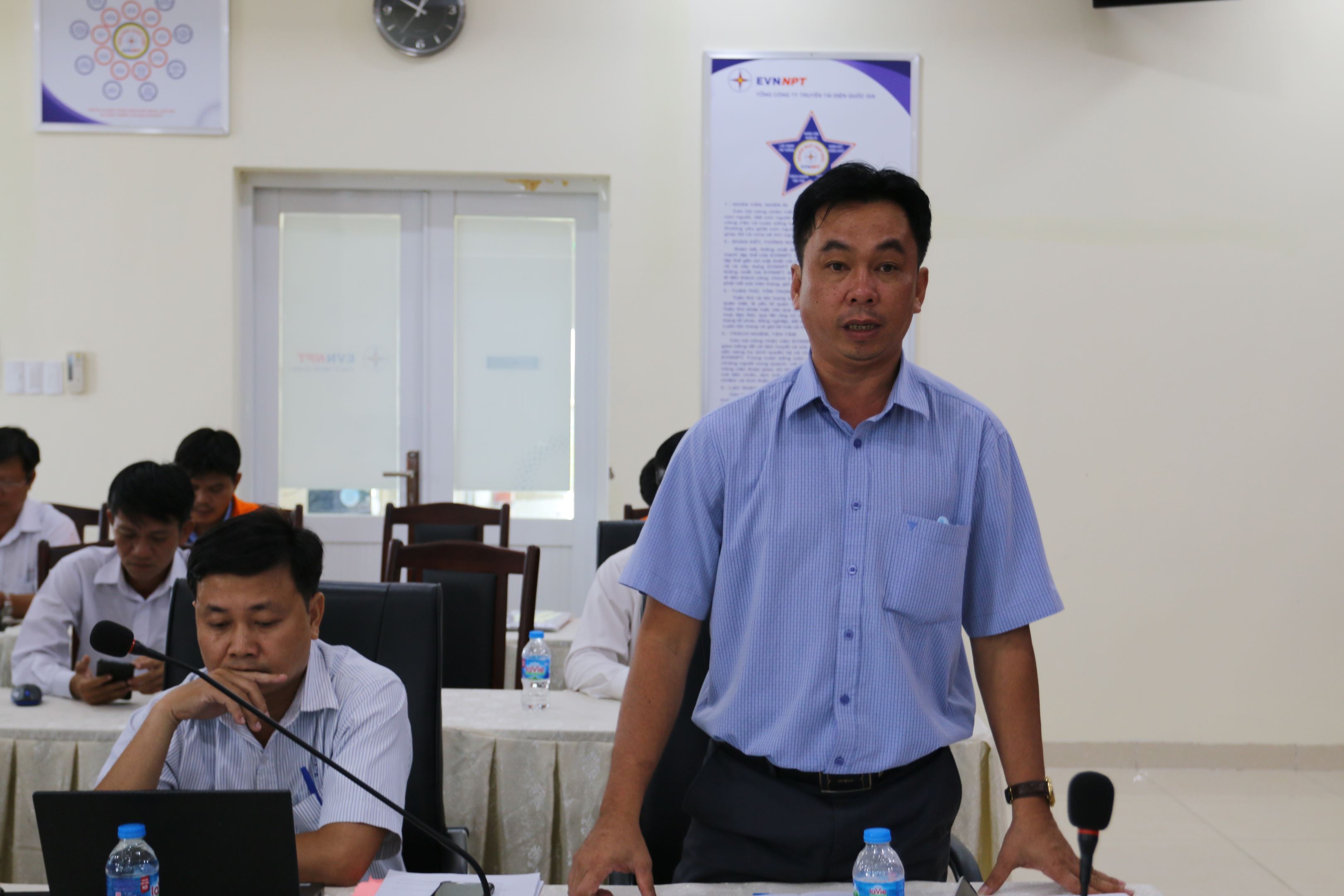 Anh Phùng Quang Đại - Cán bộ an toàn Phòng Kỹ thuật Truyền tải điện miền Đông 2 trao đổi một số kiến nghị tại hội thảo.