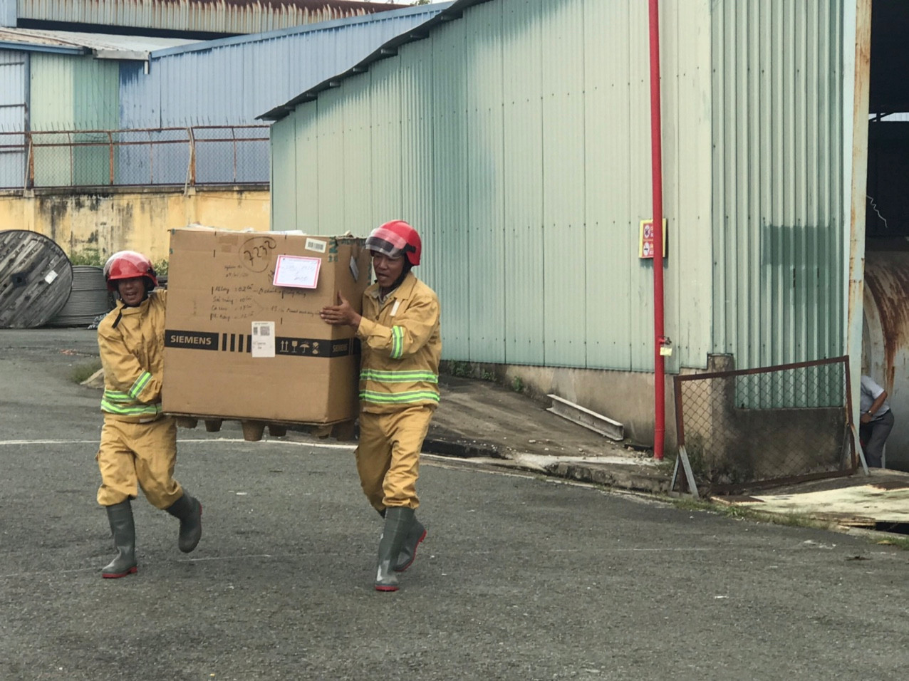Các học viên (lực lượng chữa cháy tại kho vật tư Công ty) di chuyển tài sản ra ngoài.