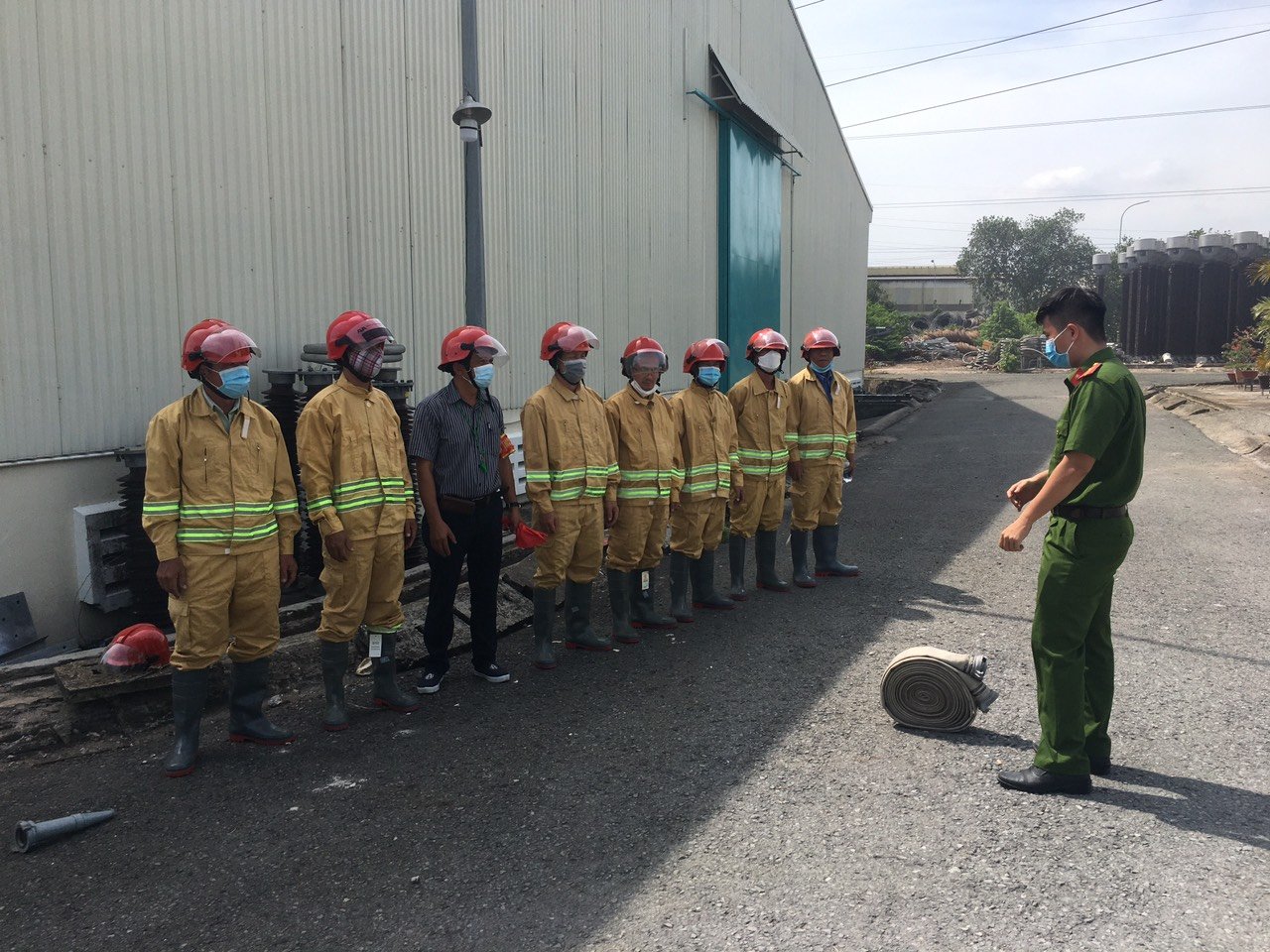 Các học viên (lực lượng chữa cháy tại kho vật tư Công ty) đang thực hành thao tác chữa cháy nhà kho.