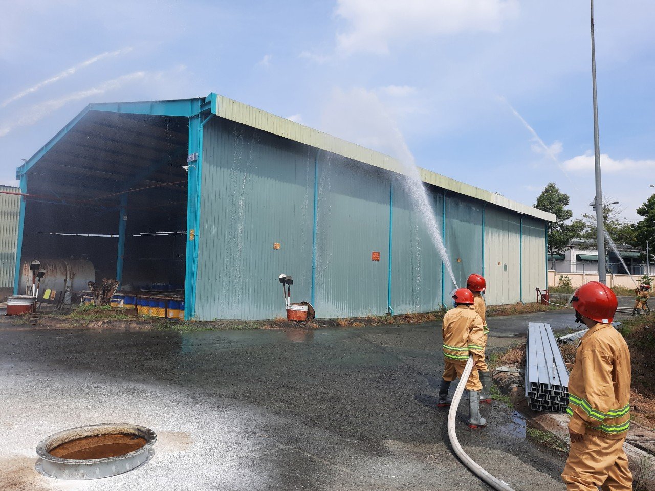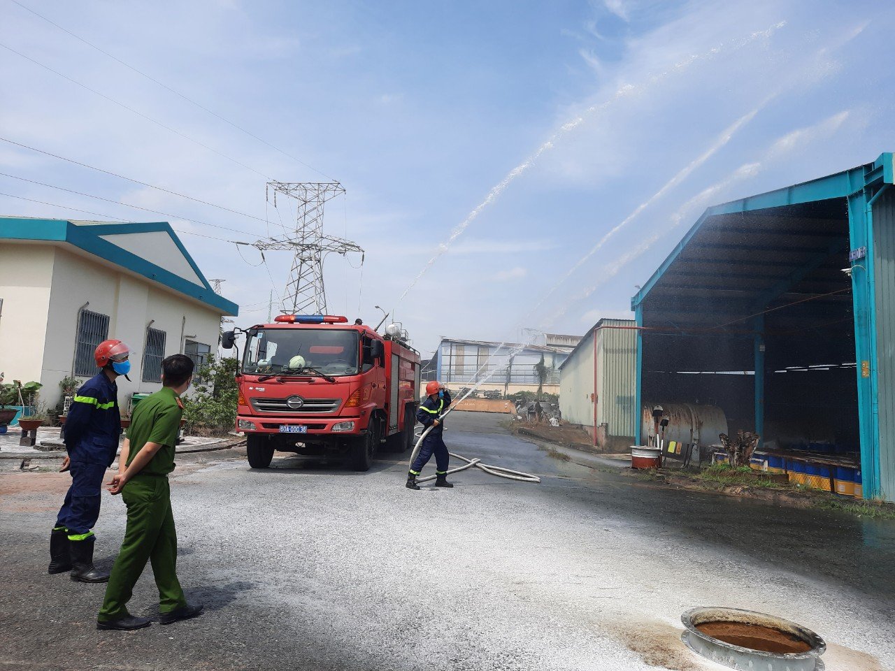 Lực lượng chữa cháy chuyên nghiệp (CA PCCC tỉnh Đồng Nai) đang thực hành thao tác chữa cháy nhà kho.