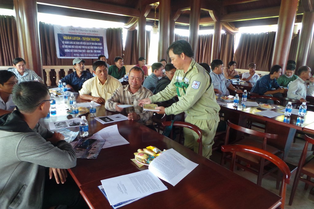 Công nhân kỹ thuật Đội TTĐ. Nhơn Trạch phát tờ rơi tuyên truyền và giải thích các nguy cơ sự cố lưới điện cho tài xế tại buổi tập huấn.