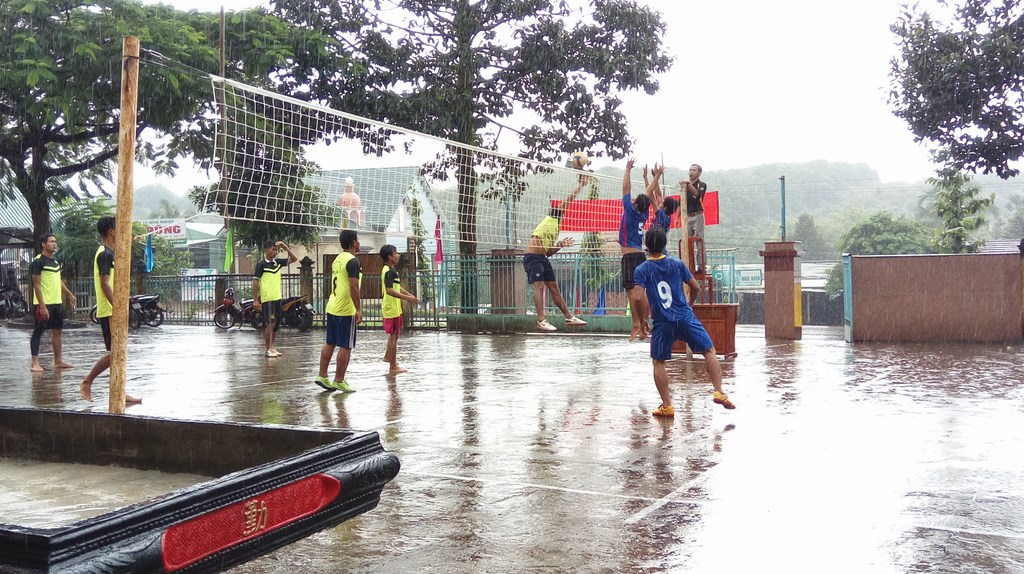 Các Đội đang trong trận đấu dưới trời mưa.
