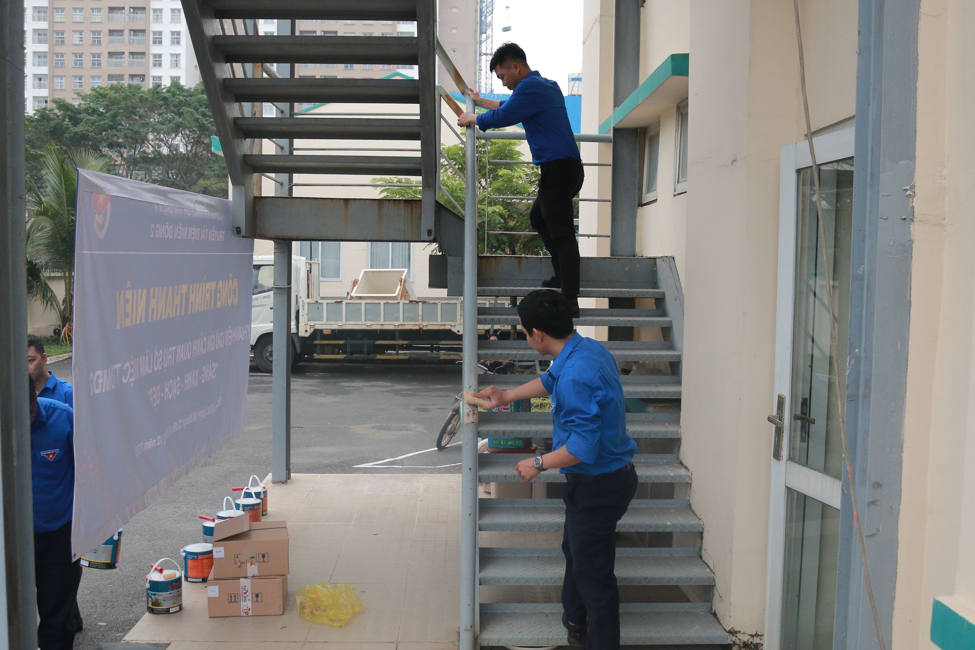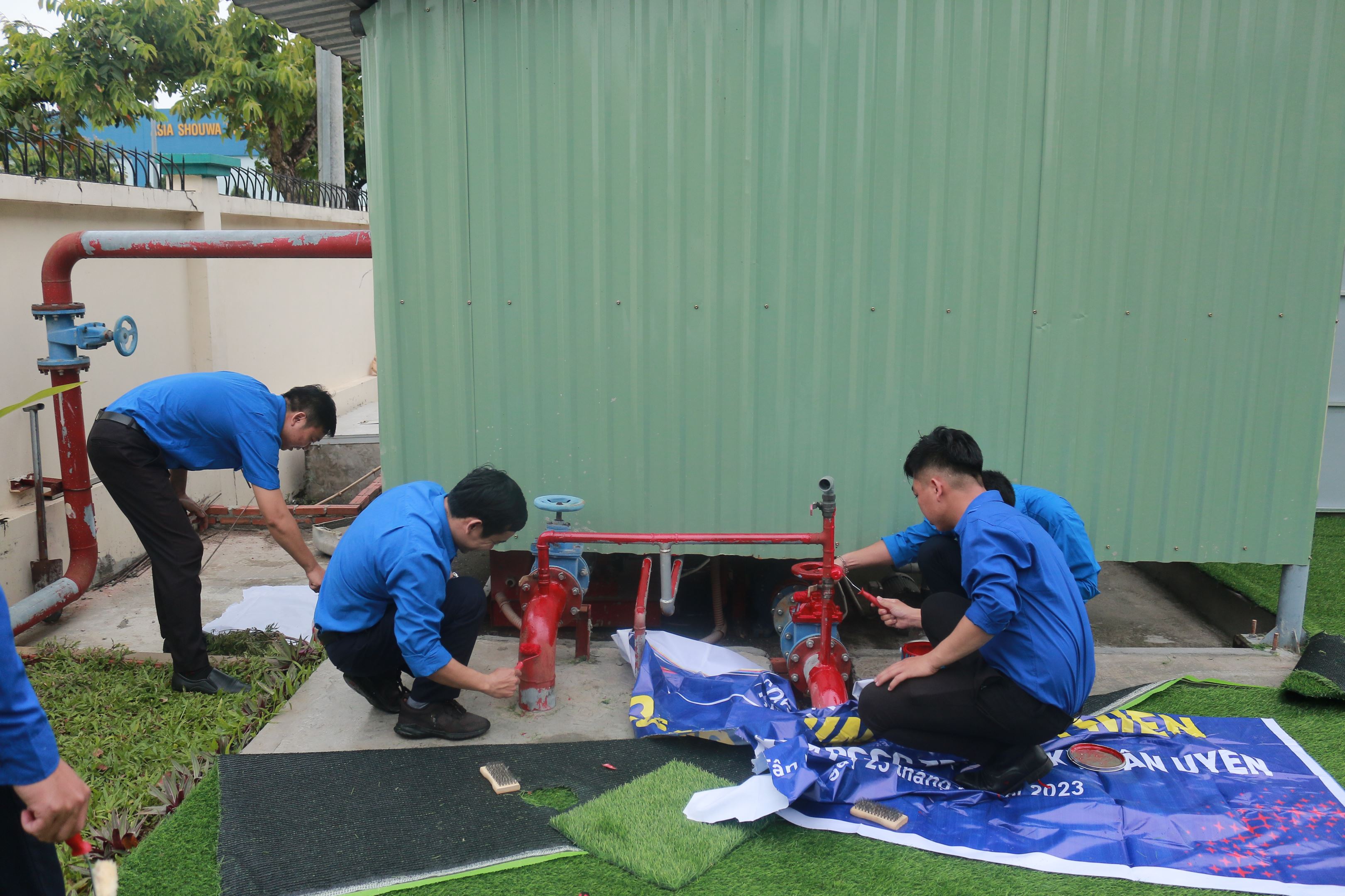 Theo kế hoạch, chia thành 02 nhóm, nhóm thực hiện sơn hệ thông đường ống PCCC, nhóm thực hiện sơn cầu thang bộ thoát hiểm. Trưởng mỗi nhóm đã phân công cho các đoàn viên vệ sinh bề mặt đường ống, cạo bỏ hoàn toàn lớp sơn cũ, vệ sinh vết bẩn bám trên bề mặt ống, làm sạch các vết dầu mỡ, bụi bẩn. Sau đó nhóm đã tiến hành lăn một lớp sơn lót loại epoxy chống gỉ, chờ cho đến khi thật khô rắn thì tiếp tục lăn một lớp sơn phủ màu đỏ còn lại cho lớp sơn thật đều và bóng mịn.