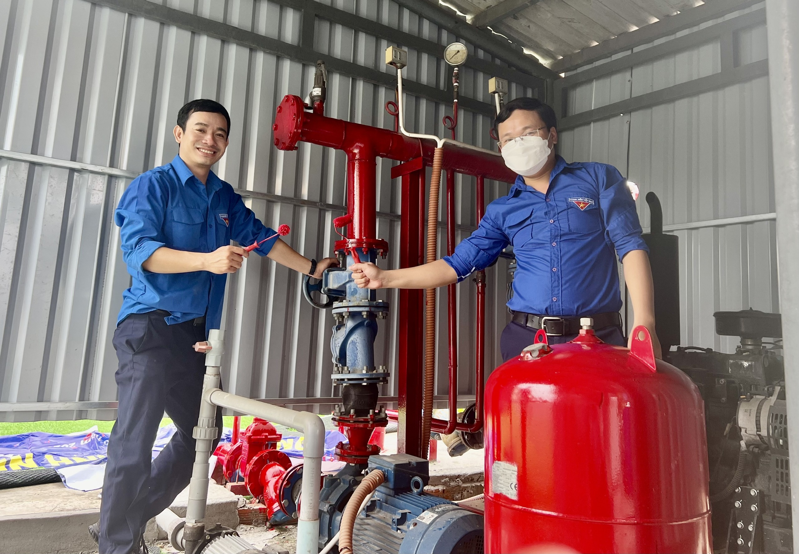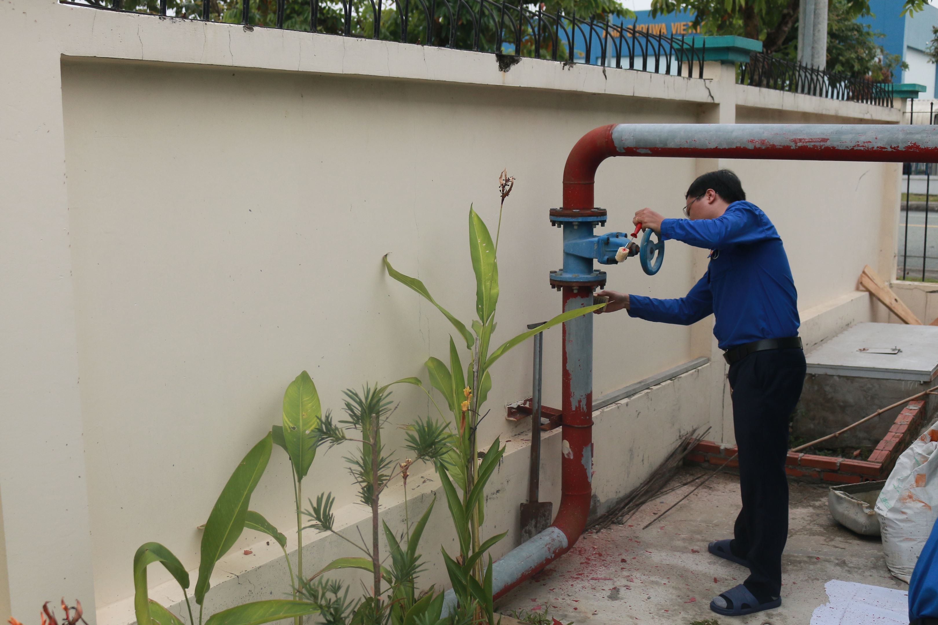 Đoàn viên thanh niên thực hiện sơn lại hệ thống ống PCCC