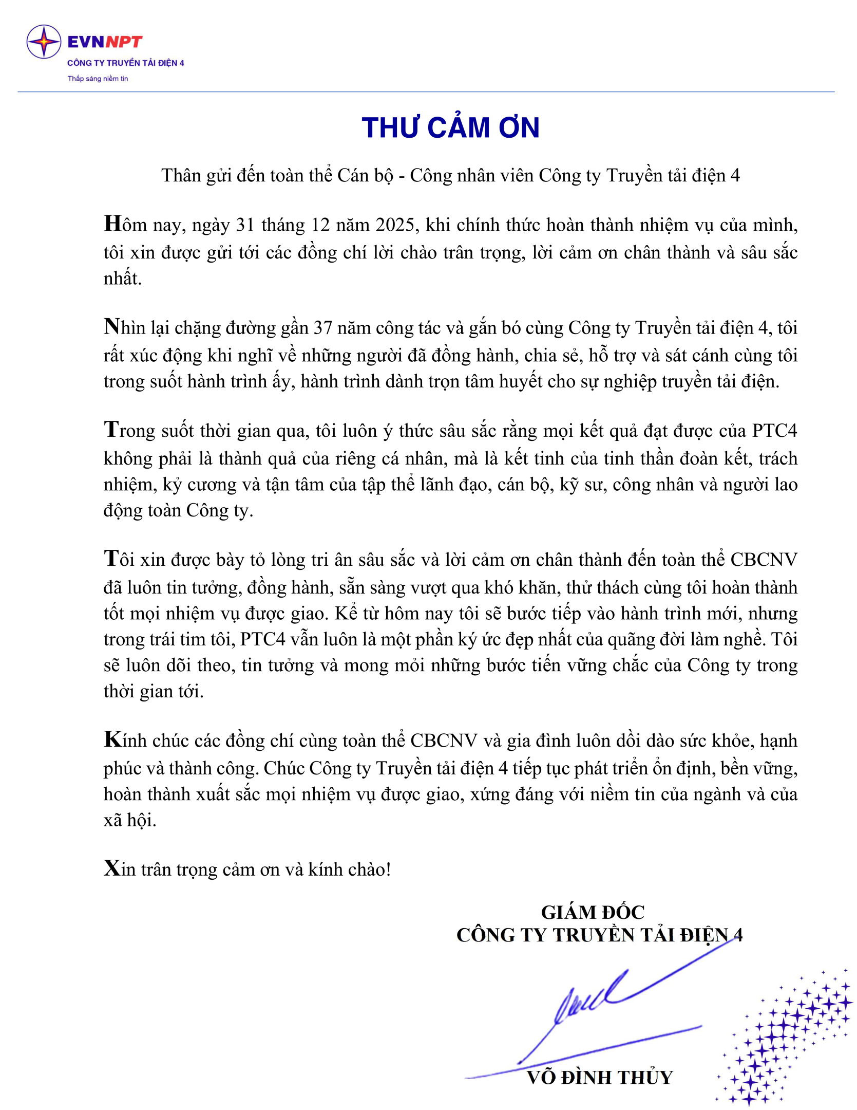 Ngày 31 tháng 12 năm 2025, khi hoàn thành nhiệm vụ, Giám đốc Võ Đình Thủy gửi thư cảm ơn đến toàn thể cán bộ công nhân viên Công ty Truyền tải điện 4.