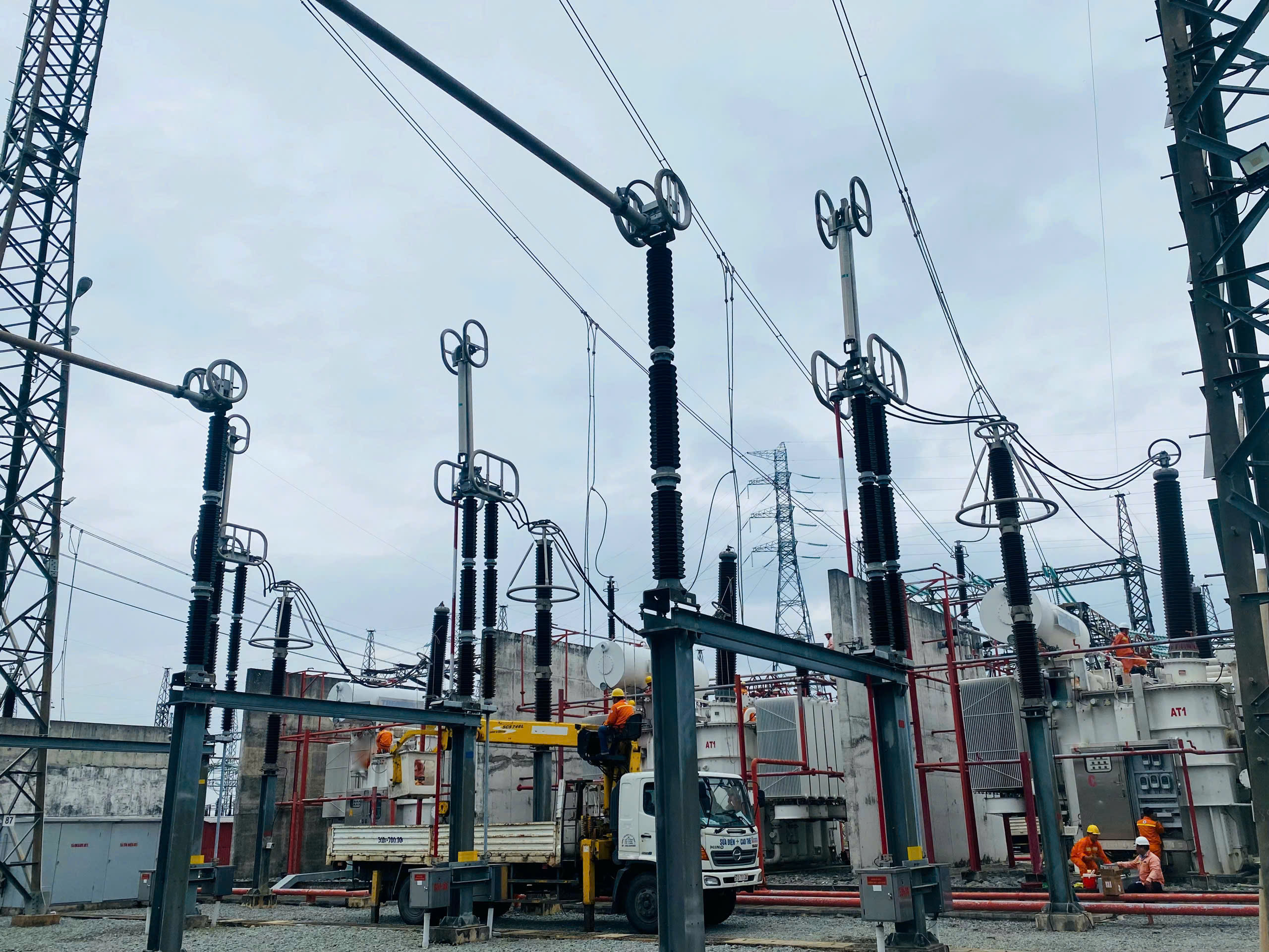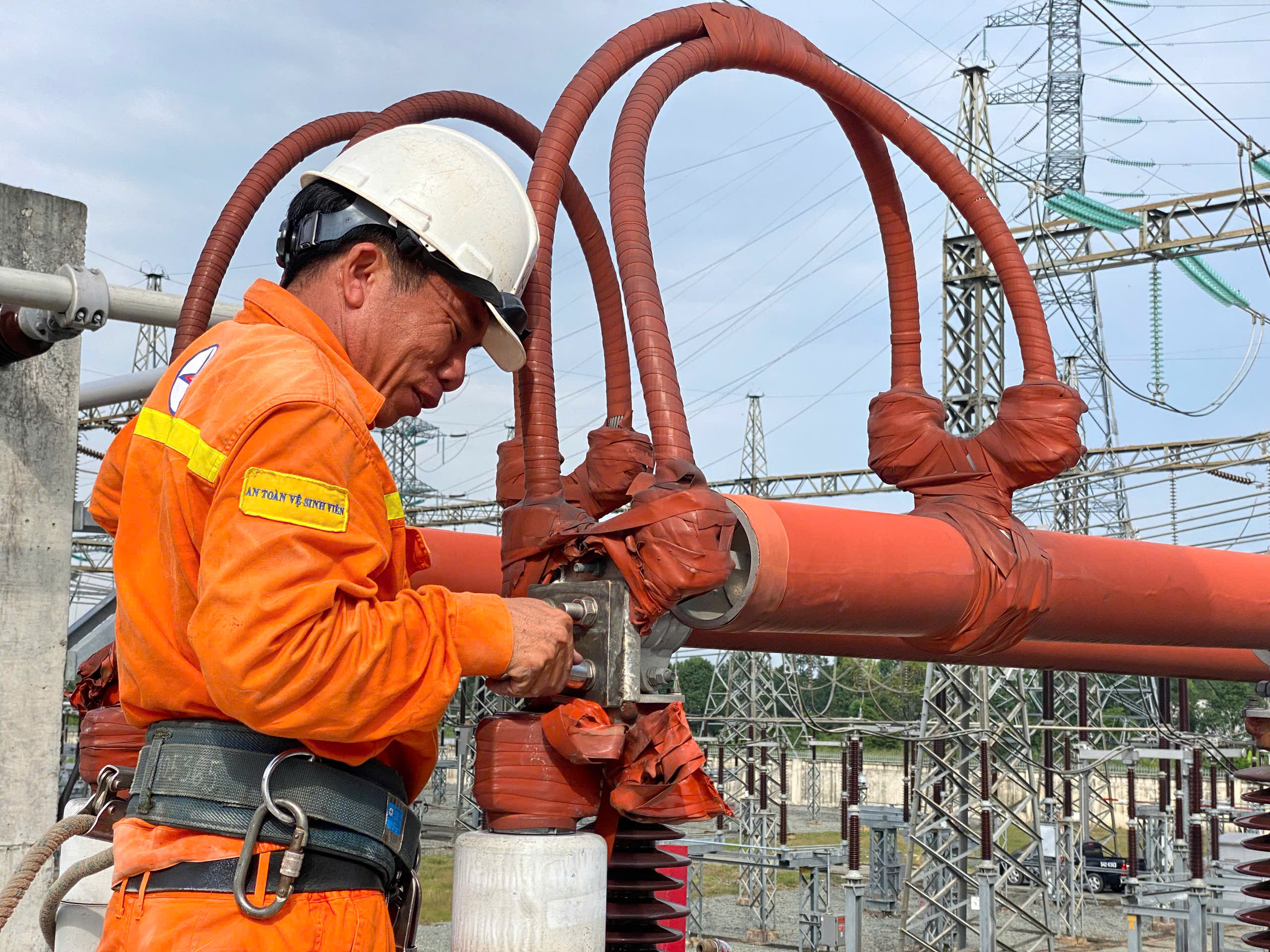 Nhân viên Trung tâm dịch vụ kỹ thuật 4 công tác tại MBA AT1 tại trạm 500kV Tân Định.