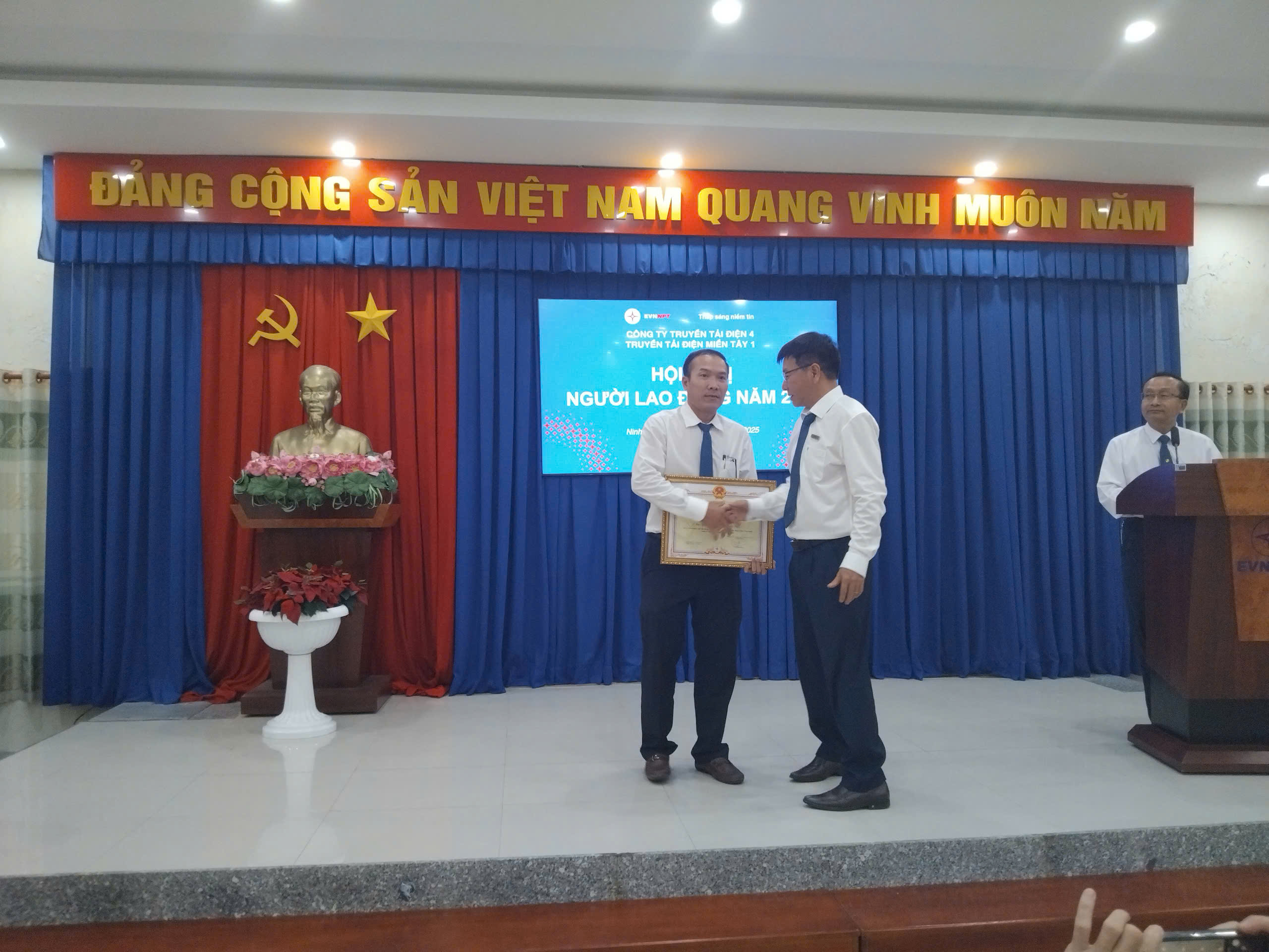 Ông Nguyễn Văn Bảy, Phó Giám đốc Công ty, Phó Chủ tịch Công đoàn Công ty trao Giấy khen cho anh Phạm Ngọc Luật tại Hội nghị.