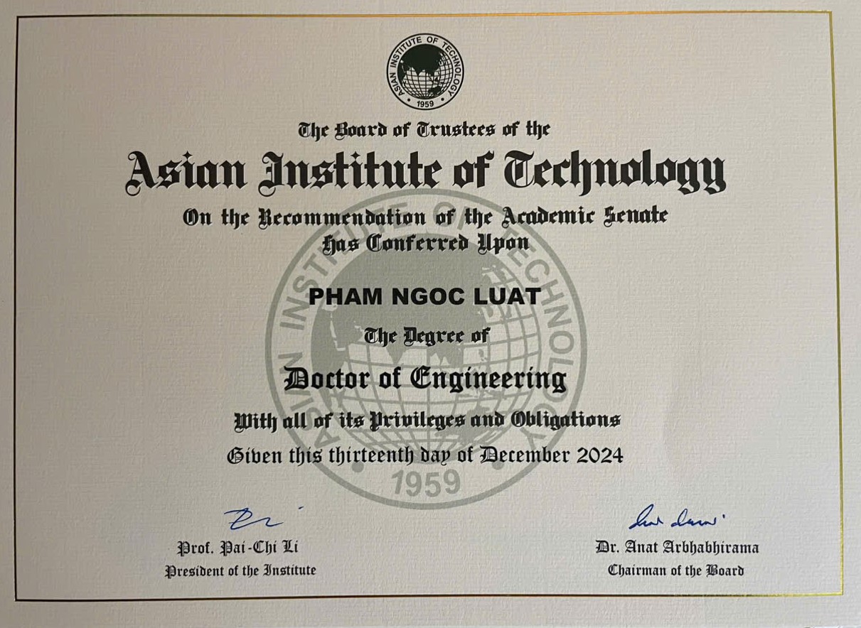 Bằng Tiến sĩ Kỹ thuật của anh Phạm Ngọc Luật được Viện Công nghệ châu Á (AIT) cấp