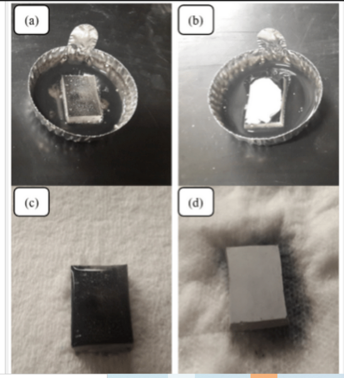 H.8. Huyền phù bẩn đa thành phần lắng lại trên (a) cao su mịn nhẵn và (b) bề mặt cao su silicon siêu kỵ nước. Làm sạch bề mặt bằng cách sử dụng cùng một lượng nước khử ion cho (c) bề mặt cao su silicone mịn và (d) siêu kỵ nước.