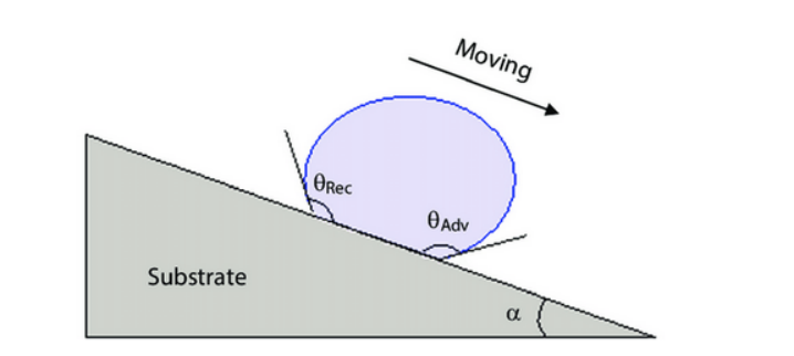 Vài khái niệm quan trọng, là góc tiếp xúc của nước (WCA: Water Contact Angle) và góc trượt (SA : Sliding Angle ) hay còn gọi là Độ trễ góc tiếp xúc (CAH : Contact Angle Hysteresis), như sau:
