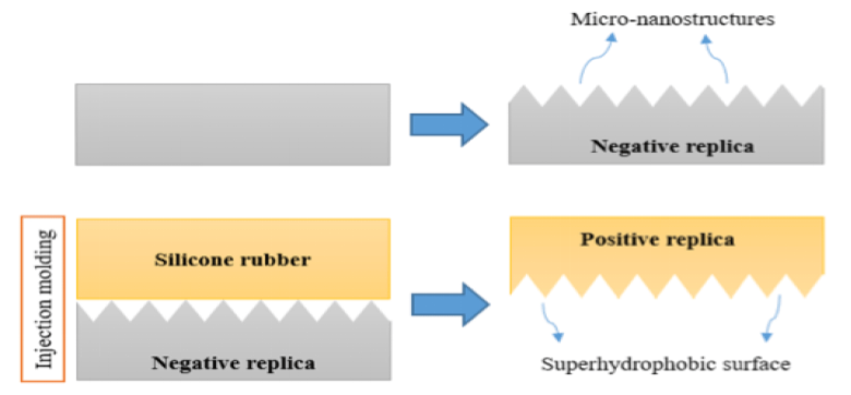 Có sẵn nhiều phương pháp để sản xuất các bề mặt siêu kỵ nước nhưng người ta hay chọn nhân bản trực tiếp vì nó đơn giản, hiệu quả , rẻ tiền và cũng có thể dễ dàng được công nghiệp hóa. Sử dụng phương pháp này, bề mặt không trải qua các thay đổi hóa học. Đúng hơn, một cấu trúc nano vi mô thích hợp được tạo ra trên bề mặt của một bản sao âm. Một bản sao dương (cao su silicone) sau đó được tạo ra bằng phương pháp ép phun (xem H. 1). Do đó, các bề mặt cao su silicone siêu kỵ nước được tạo ra thể hiện khả năng chống thấm nước cực cao cũng như các đặc tính tự làm sạch trong các điều kiện ô nhiễm khác nhau.
