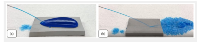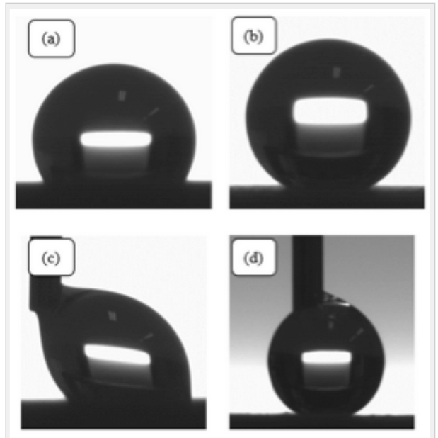 H.2. Góc tiếp xúc tĩnh của nước với (a) bề mặt cao su silicone trơn và (b) bề mặt cao su silicone siêu kỵ nước và góc tiếp xúc động của nước trên (c) bề mặt cao su silicone trơn và (d) bề mặt cao su silicone siêu kỵ nước.