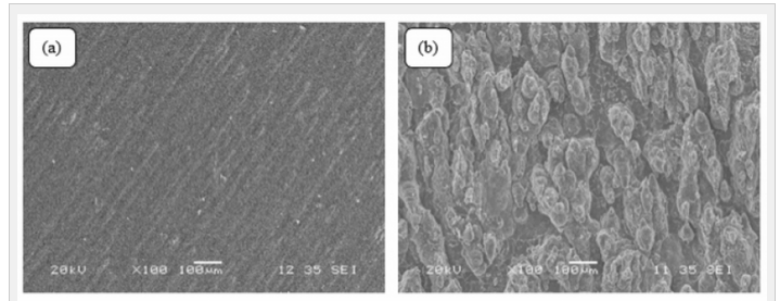 H.3. Ảnh SEM của (a) bề mặt cao su silicone mịn và (b) bề mặt cao su silicone siêu kỵ nước.
