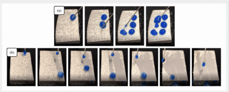 Kiểm tra bằng tia nước để xác nhận đặc tính chống thấm nước cực cao của bề mặt. Ở đây, tia nước được tạo ra bằng một ống tiêm có gắn kim, dưới lực tác dụng bình thường, lên cả mẫu kỵ nước và siêu kỵ nước được đặt trên một bề mặt phẳng. Khi tia nước được phun vào lớp cao su silicone mịn, nước sẽ tích tụ trên bề mặt của nó (xem Hình 5a). Nhưng khi một tia nước tác động vào bề mặt cao su silicone siêu kỵ nước, nó sẽ nẩy bật ra (xem Hình 5b). Điều này chứng tỏ rằng dòng nước áp suất cao không thể tồn tại trên bề mặt của các cấu trúc nano vi mô, tức là tính siêu kỵ nước của bề mặt được sản xuất ( nhân bản ra) là ổn định.