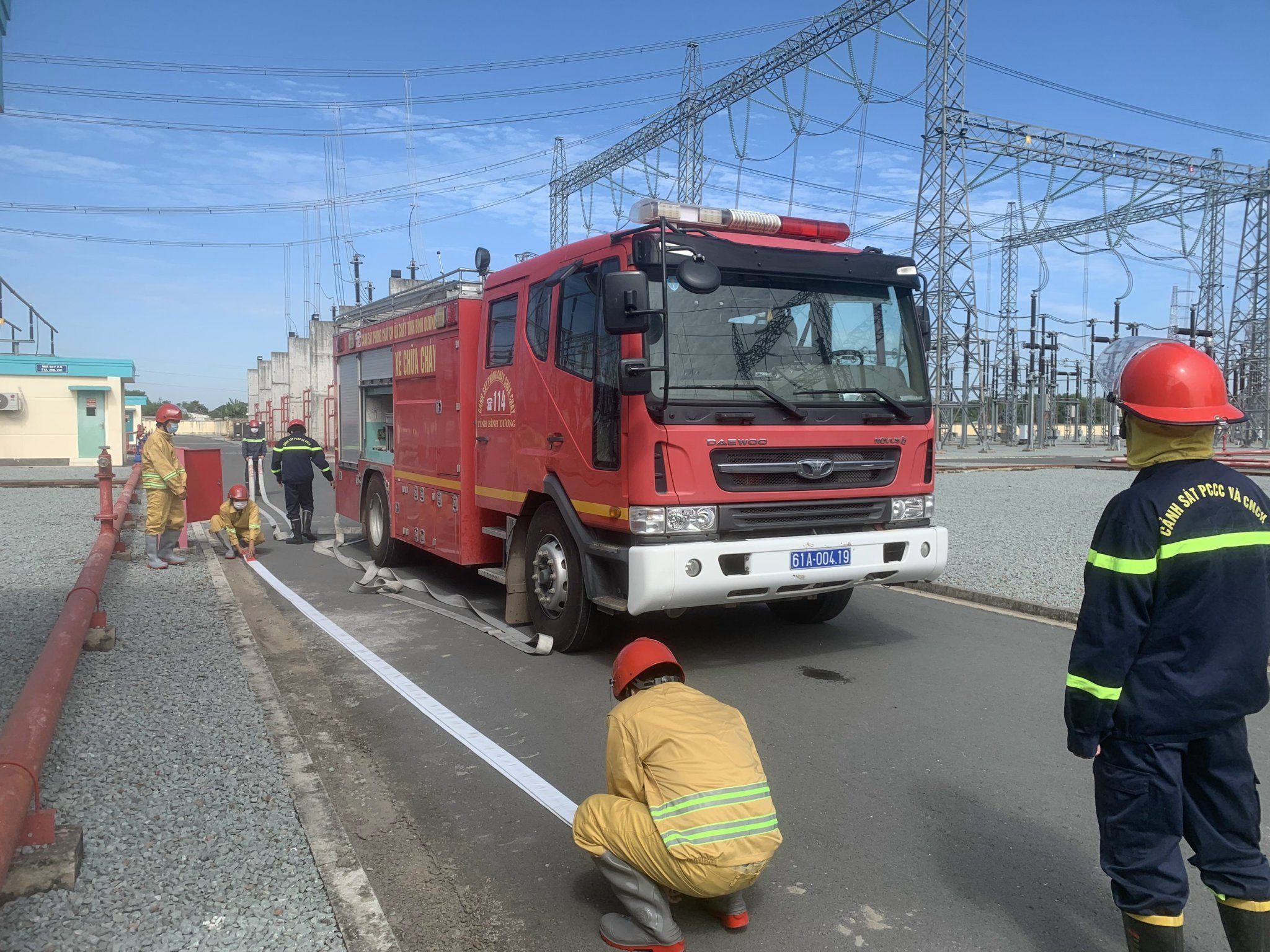 Nhận được tin báo cháy của Trạm biến áp 500kV Tân Uyên, Đội PCCC&CNCH khu vực Vĩnh Tân – Phòng Cảnh sát PCCC&CNCH – Công an tỉnh Bình Dương đã điều động lực lượng, phương tiện gồm: 02 xe chữa cháy cùng 08 cán bộ chiến sĩ đến điểm thực tập lúc 10 giờ15 phút. Triển khai đội hình đúng theo phương án chữa cháy đã được phê duyệt.