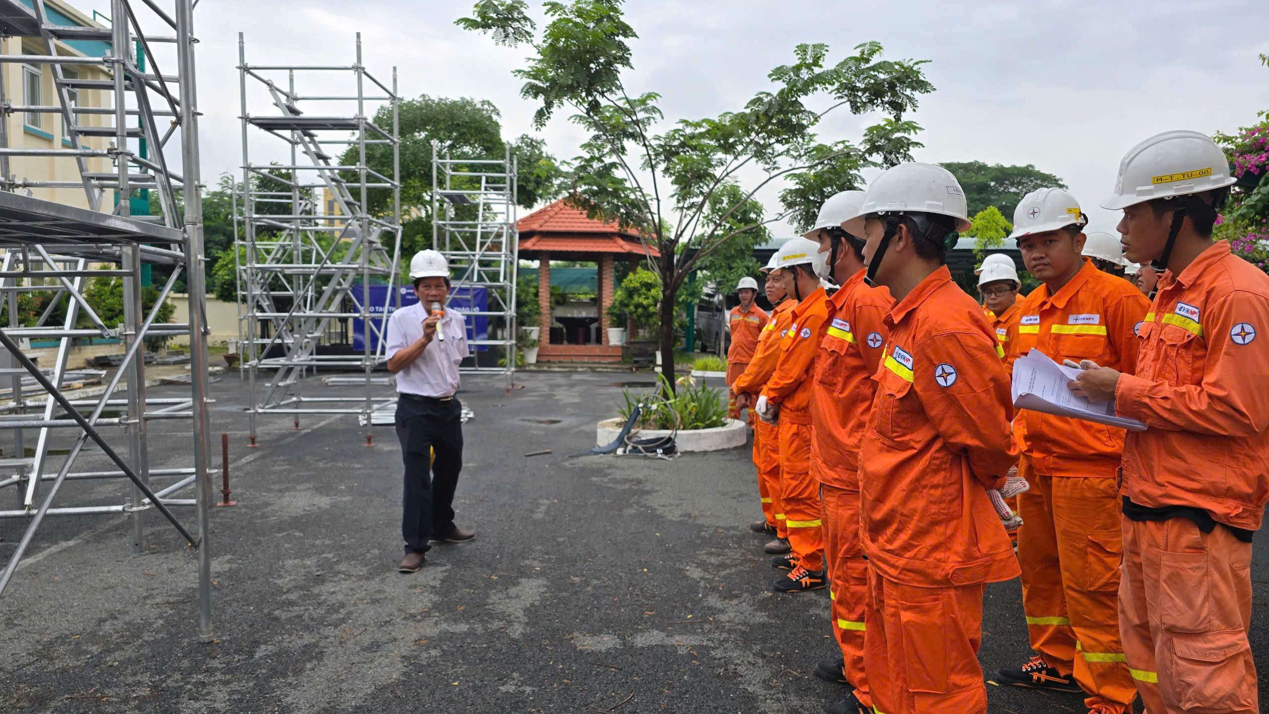 Nội dung bồi huấn gồm công tác đánh giá và chuẩn bị tổ chức khảo sát kỹ hiện trường tại TBA, xác định vị trí, không gian làm việc, các thiết bị điện hiện có và các yếu tố có thể gây nguy hiểm.Lập kế hoạch chi tiết về công việc, bao gồm: loại giàn giáo Ringlock cần sử dụng, vị trí lắp đặt, trình tự thực hiện, và các biện pháp an toàn cụ thể. Trang bị đầy đủ phương tiện bảo vệ cá nhân ( nón bảo hộ, giày cách điện, quần áo bảo hộ, găng tay cách điện (phù hợp với cấp điện áp), kính bảo hộ và dây deo an toàn 02 móc.Các cách hiệu quả và phổ biến nhất để chống ngã, chống đổ giàn giáo Ringlock như thi công trên nền đất chắc chắn, bằng phẳng, dùng chân đế điều chỉnh có bản đế lớn, liên kết giằng chéo đầy đủ và đúng kỹ thuật, neo giàn giáo vào công trình, không vượt quá tải trọng cho phép, dùng lan can bảo vệ và tấm ván thao tác chắc chắn, kiểm tra, bảo trì định kỳ, không sử dụng trong điều kiện thời tiết xấu