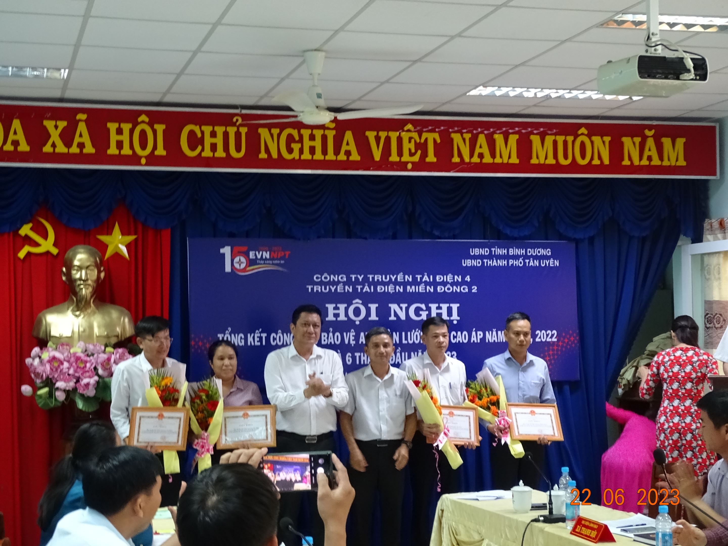 Ông Huỳnh Văn Lợi - Phó chủ tịch Tp .Tân Uyên và Ông Nguyễn Văn Lịch- Phó Giám đốc Truyền tải điện miền Đông 2 trao Giấy khen của Chủ tịch UBND Tp. Tân Uyên cho tập thể