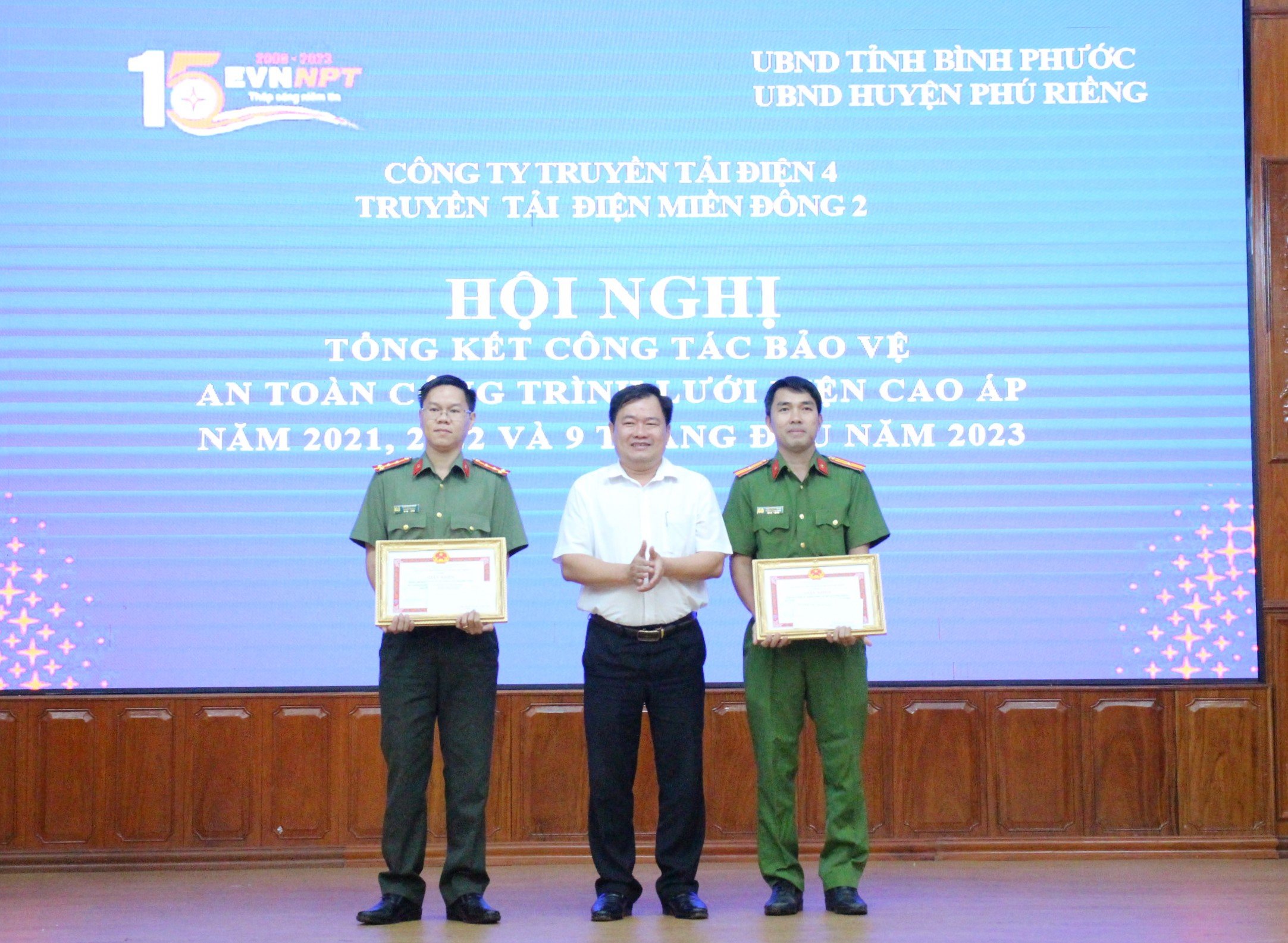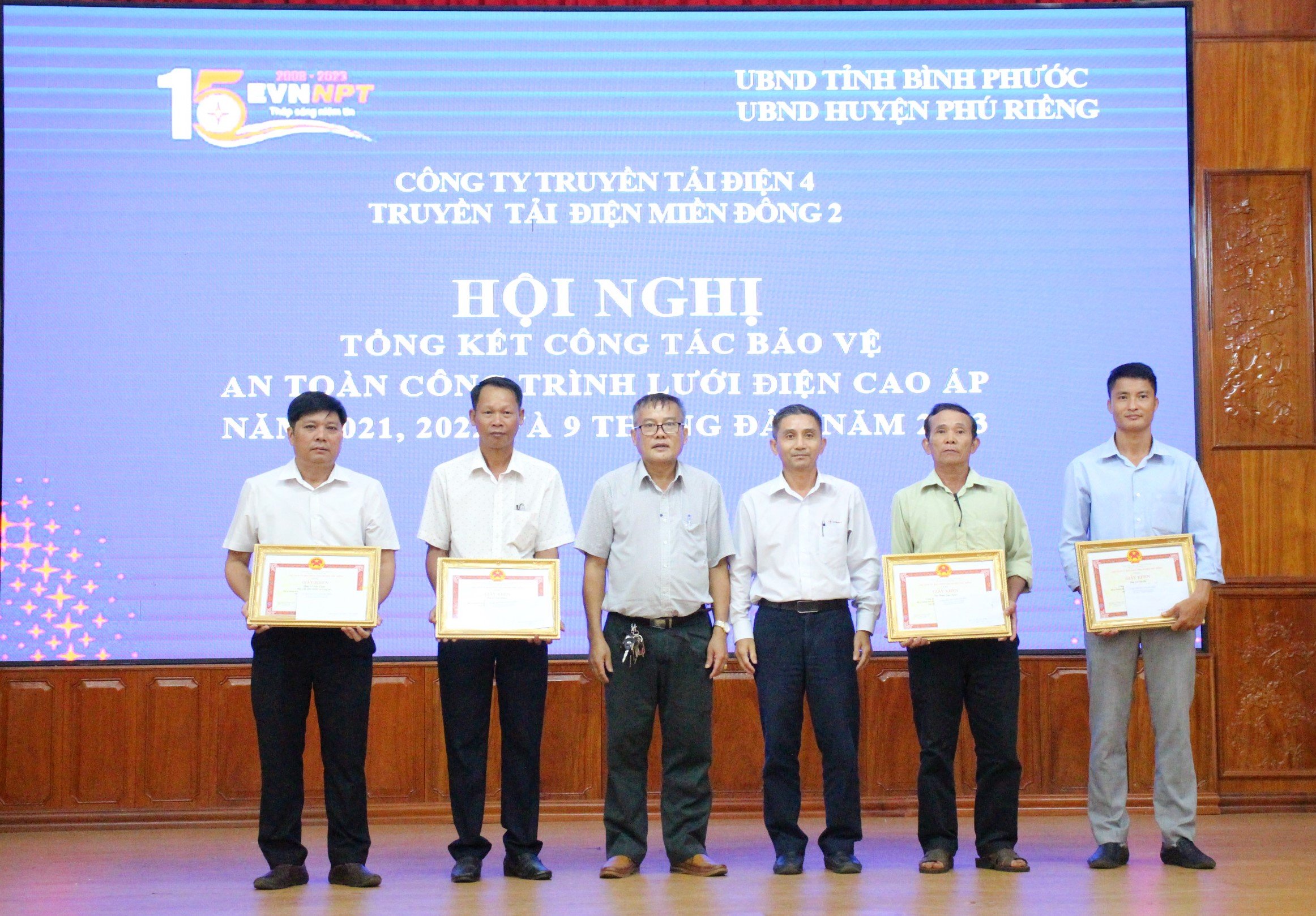 Lê Văn Chung - Phó Chủ tịch huyện Phú Riềng, tỉnh Bình Phước cho các cá nhân có thành tích xuất sắc trong công tác bảo vệ hệ thống Truyền tải điện.