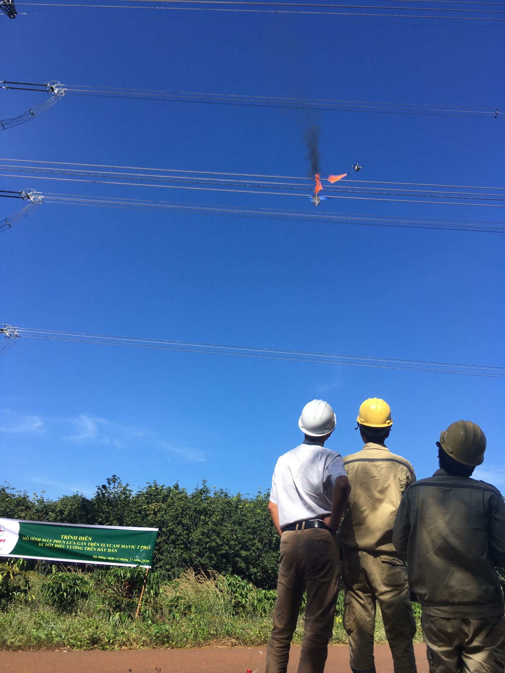 Flycam đang đốt vật bay vướng vào dây dẫn.