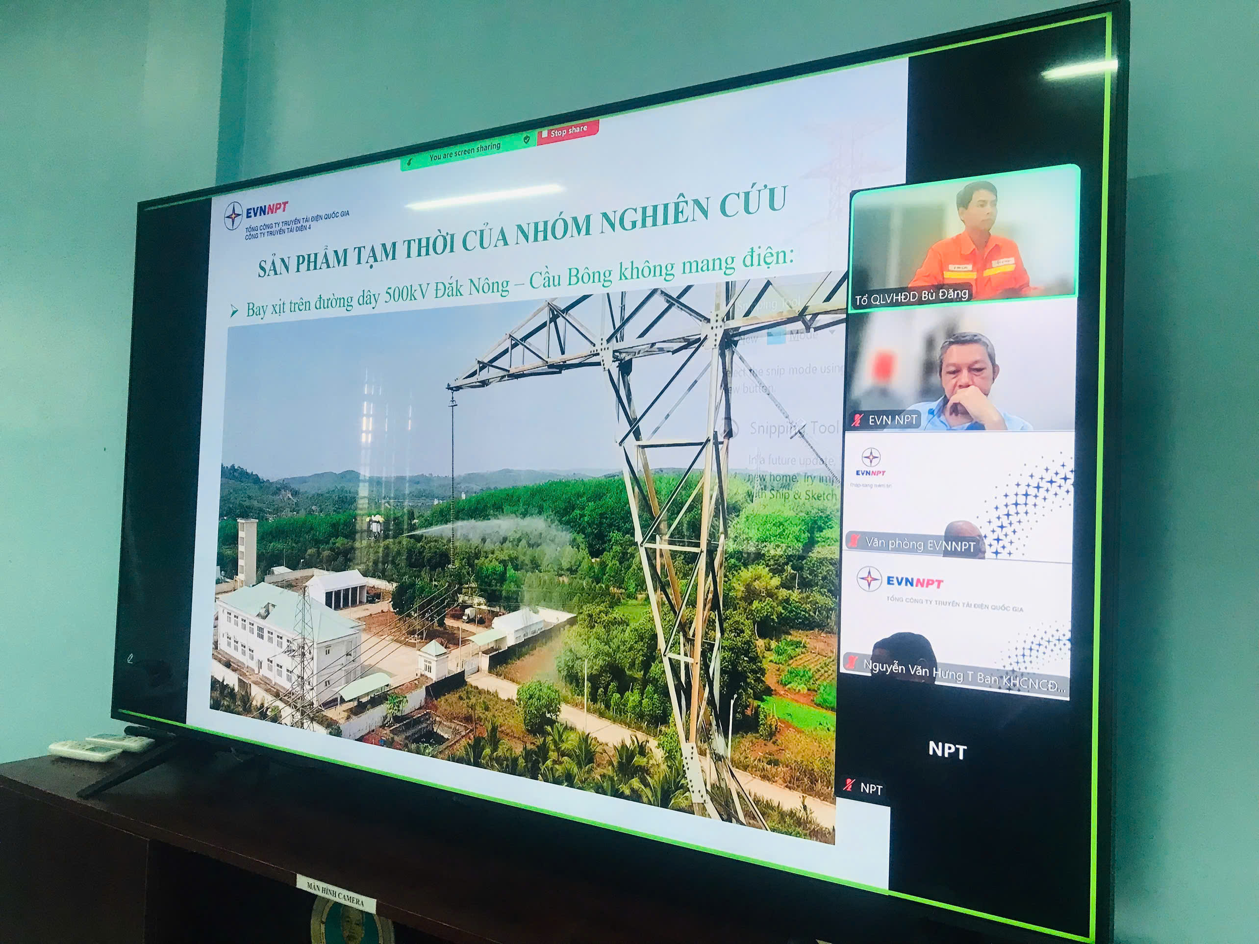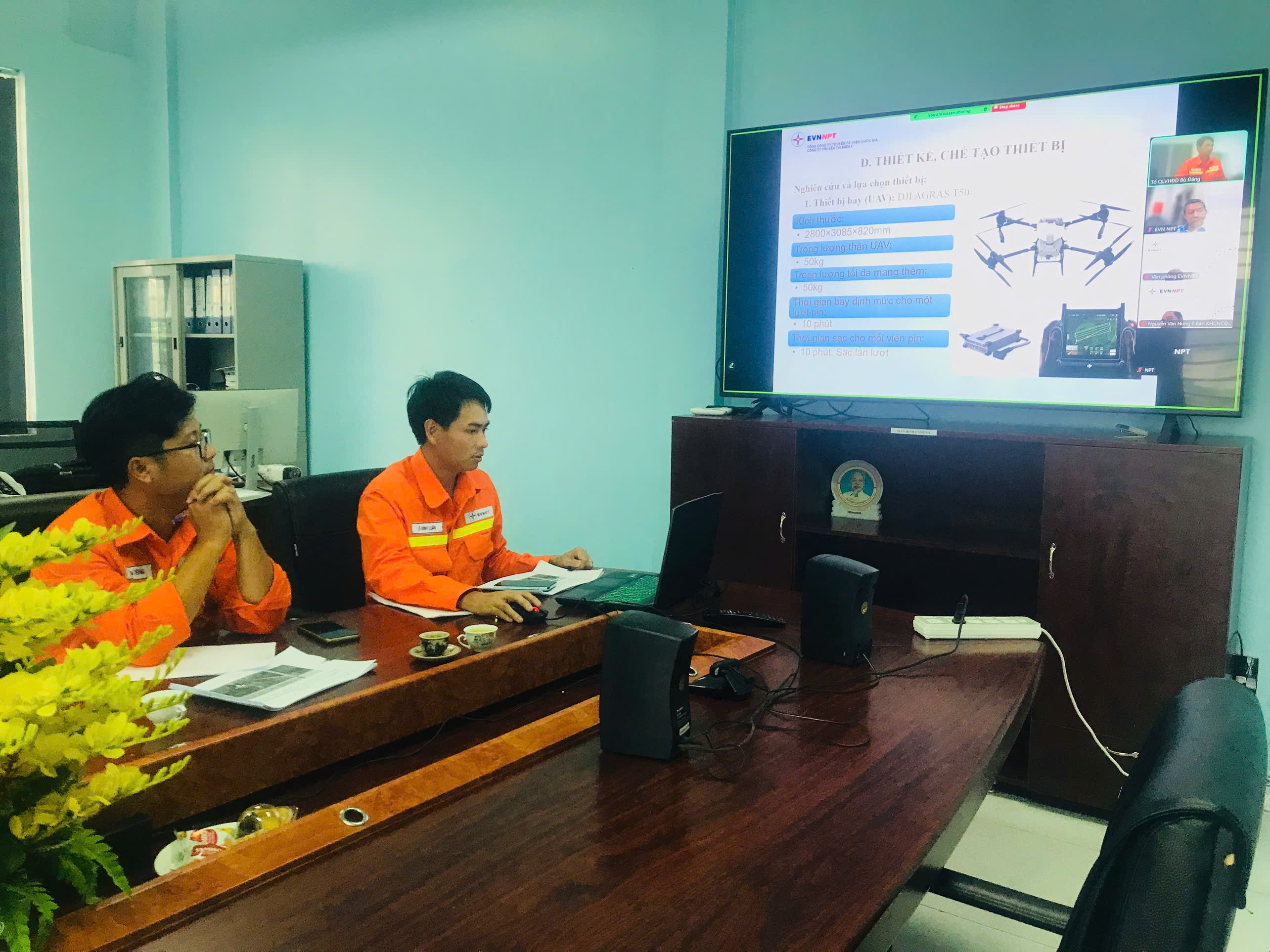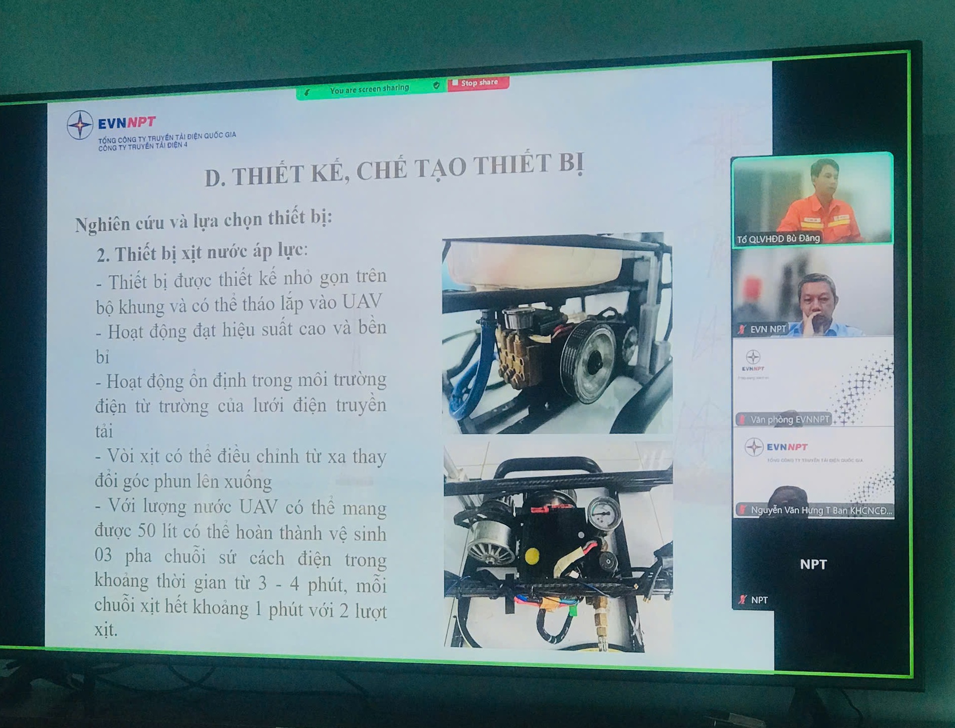 Tại cuộc họp, nhóm nghiên cứu đã trình bày quá trình thực hiện đề tài gồm các nội dung: mục tiêu, giải pháp kỹ thuật, thiết kế – chế tạo thiết bị, vận hành thử nghiệm, hiệu quả đạt được và nguồn kinh phí thực hiện. Đề tài hướng tới ứng dụng thiết bị bay không người lái (UAV) để làm sạch sứ cách điện đang mang điện, khắc phục những hạn chế của phương pháp thủ công hiện nay.