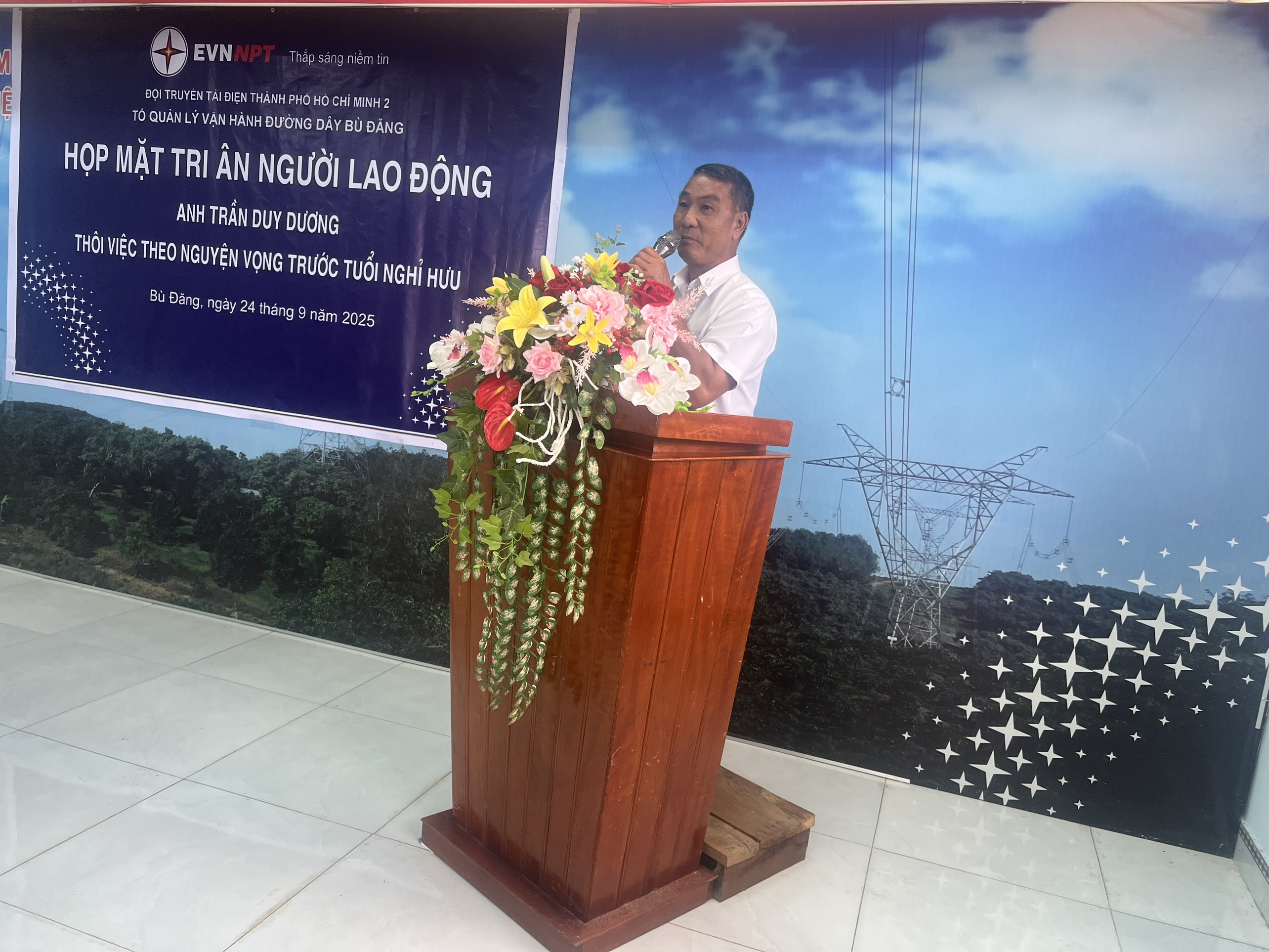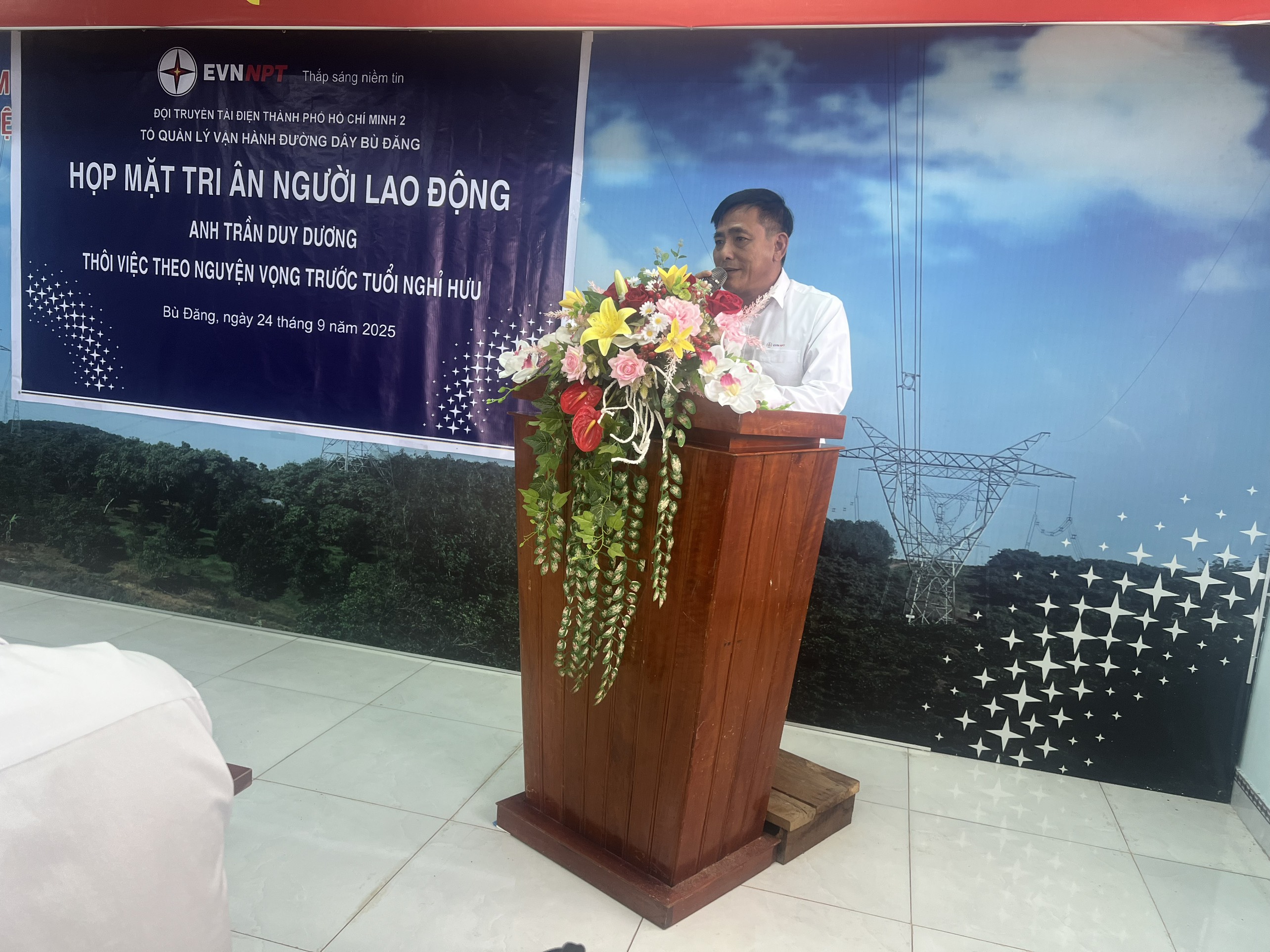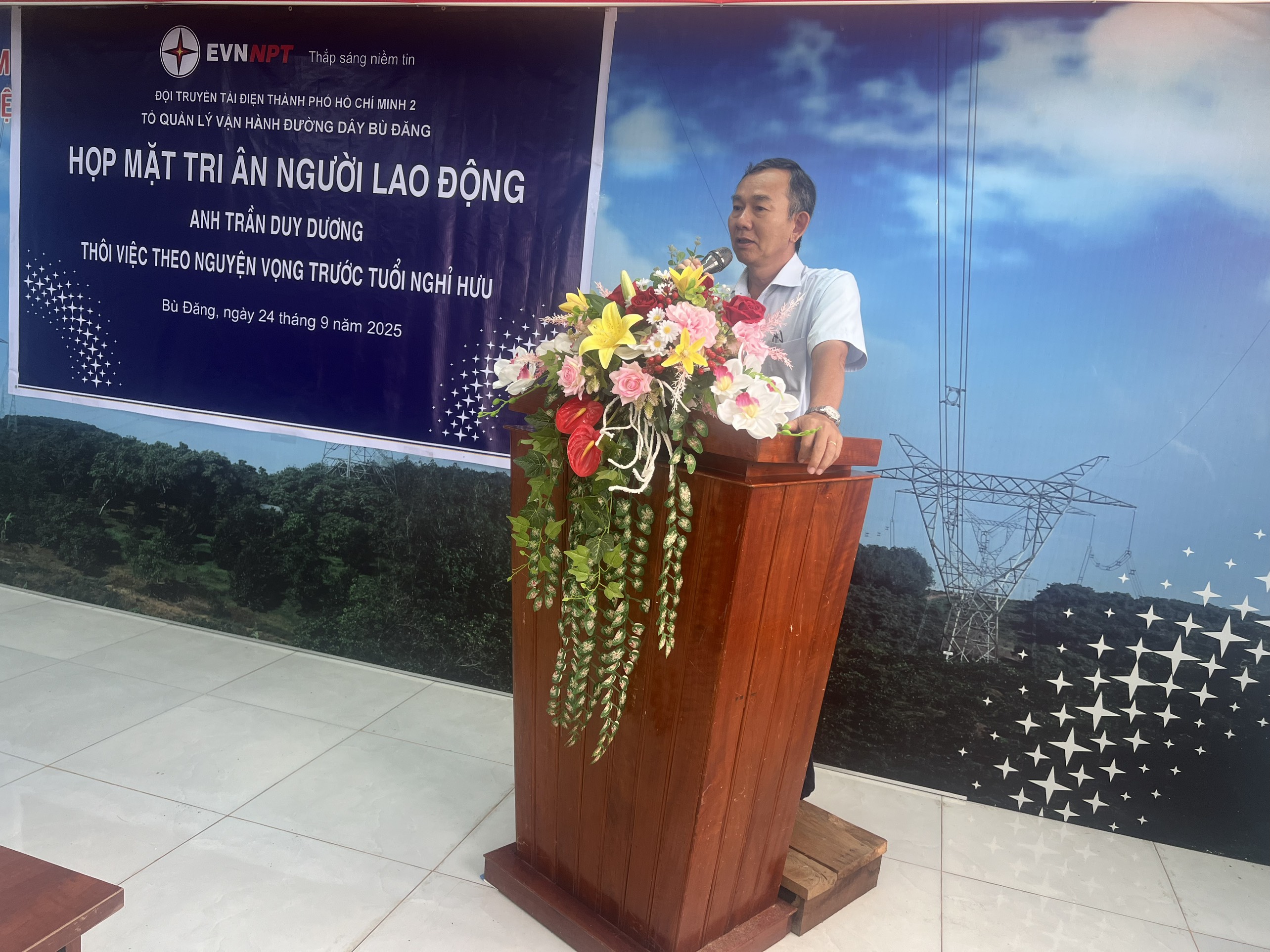 Không giấu được niềm xúc động, anh Trần Duy Dương chia sẻ: "Tôi xin bày tỏ lòng biết ơn chân thành đến các cấp Lãnh đạo, các anh em đồng nghiệp đã dành cho tôi những tình cảm và phần quà vô cùng ý nghĩa trong buổi gặp mặt ấm áp này. Tôi rất tự hào vì đã được cống hiến một phần sức lực nhỏ bé của mình cho ngành Truyền tải điện. Tôi sẽ mãi khắc ghi và trân trọng những kỷ niệm này. Xin chúc tập thể Tổ QLVH ĐD Bù Đăng và Đội TTĐ TP. Hồ Chí Minh 2 sẽ luôn đoàn kết, hoàn thành xuất sắc mọi nhiệm vụ được giao, đảm bảo lưới điện cho sự phát triển kinh tế, xã hội, an ninh chính trị đất nước".