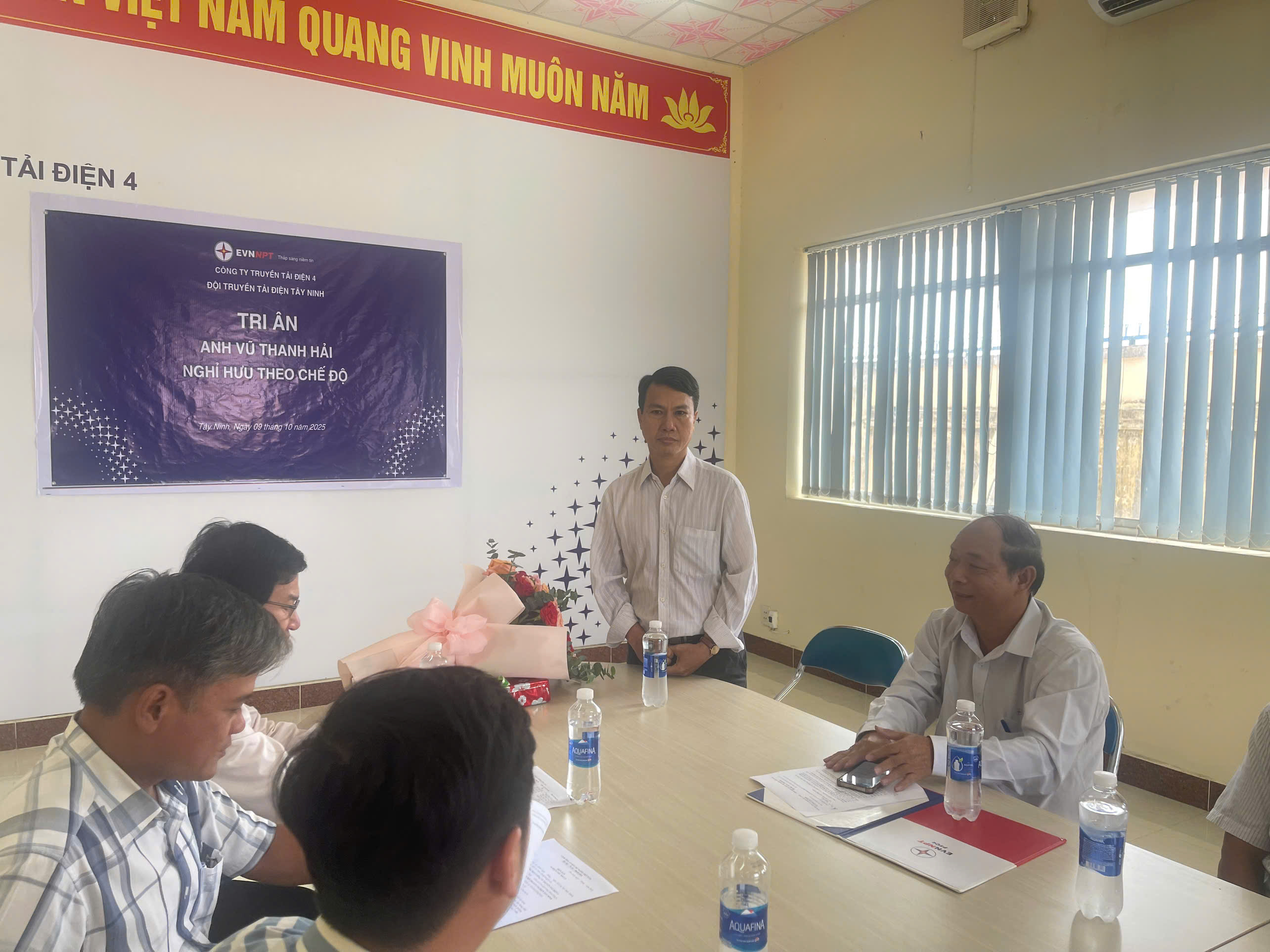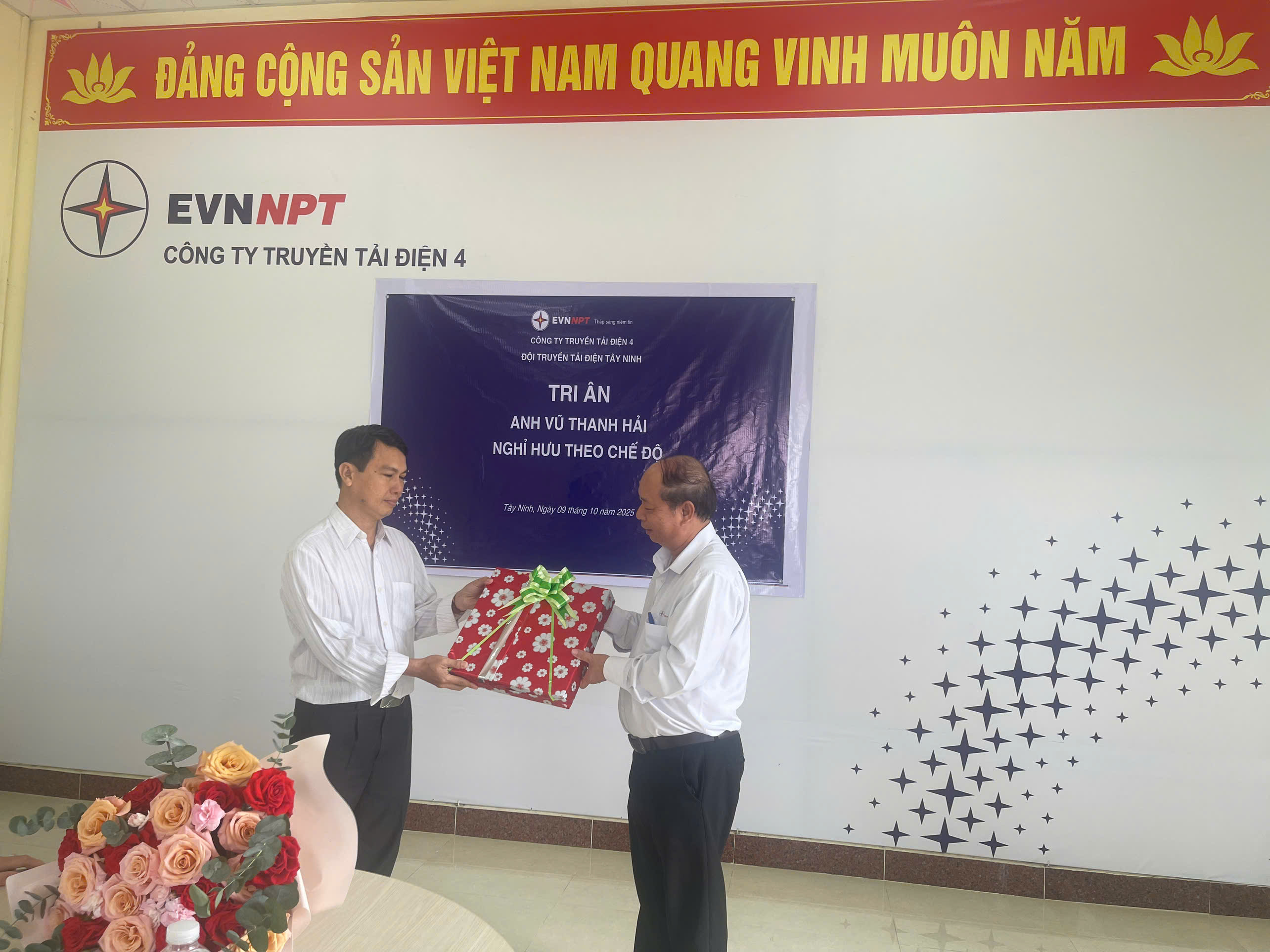 Ông Nguyễn Duy Trung - Đội trưởng Đội Truyền tải tải điện Tây Ninh trao hoa cho Anh Vũ Thanh Hải cán bộ nghỉ hưu.