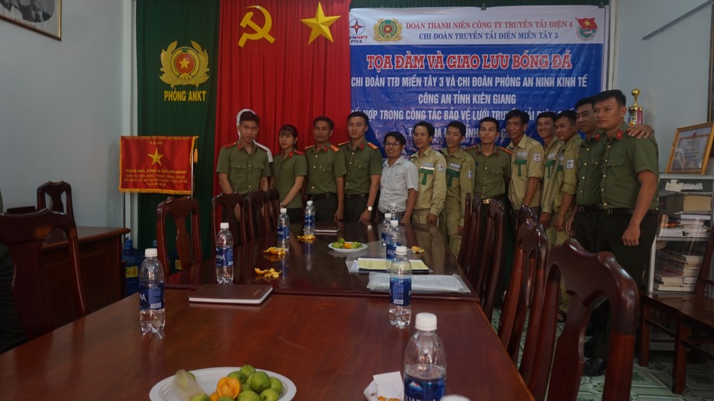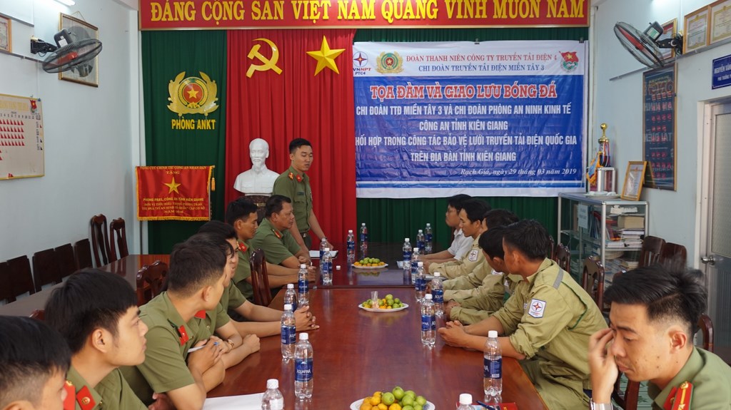 Ngày 29/03/2019, tại hội trường Phòng An ninh kinh tế CA tỉnh Kiên Giang – thành phố Rạch Giá, tỉnh Kiên Giang đã diễn ra thành công buổi tọa đàm trong công tác bảo vệ lưới Truyền tải điện Quốc gia trên địa bàn tỉnh Kiên Giang. Về phía TTĐMT3 có đồng chí Huỳnh Thái Hiệp – Bí thư chi đoàn và 09 đồng chí là ban chấp hành chi đoàn, đoàn viên, CBCNV Đội TTĐ Rạch Giá. Về phía PA04 có đồng chí thiếu tá Nguyễn Văn Tâm – Đội trưởng đội An ninh kinh tế tổng hợp, đồng chí thượng úy Thái Thành Đạt – Bí thư Chi Đoàn PA04 cùng 15 đồng chí là cán bộ, đoàn viên chi đoàn phòng PA04.