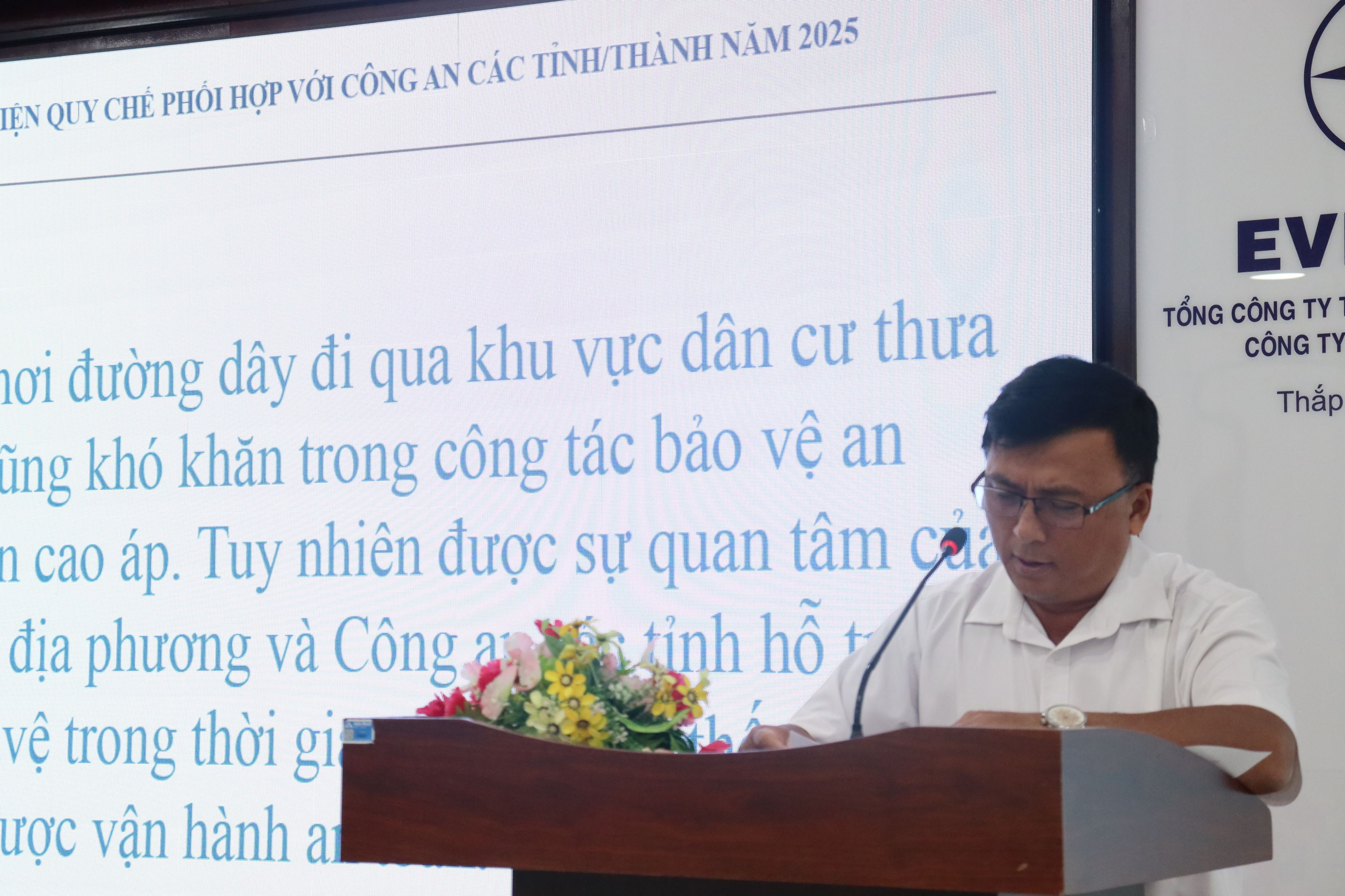 Báo cáo tổng kết đánh giá kết quả thực hiện phối hợp bảo vệ hệ thống lưới điện truyền tải trên địa bàn trong năm 2024 và kế hoạch thực hiện trong năm 2025 đã được trình bày tại Hội nghị. Theo đó, lưới điện Truyền tải điện miền Tây 2 quản lý đi qua nhiều khu vực địa hình là đồng ruộng, sông ngòi chằng chịt, rừng phòng hộ khu vực ven biển, một số nơi tuyến đường dây đi qua khu vực dân cư thưa thớt, dẫn đến công tác quản lý, bảo vệ lưới điện gặp rất nhiều khó khăn. Tuy nhiên, được sự quan tâm chỉ đạo sát sao từ Công ty Truyền tải điện 4 và sự hỗ trợ tốt từ Cơ quan Công an, Quân đội và Chính quyền địa phương nên tình hình an ninh trật tự thuộc phạm vi lưới điện do Truyền tải điện miền Tây 2 quản lý luôn đảm bảo vận hành an toàn, liên tục và ổn định, không có vụ việc mất cắp hoặc phá hoại nào xảy ra.