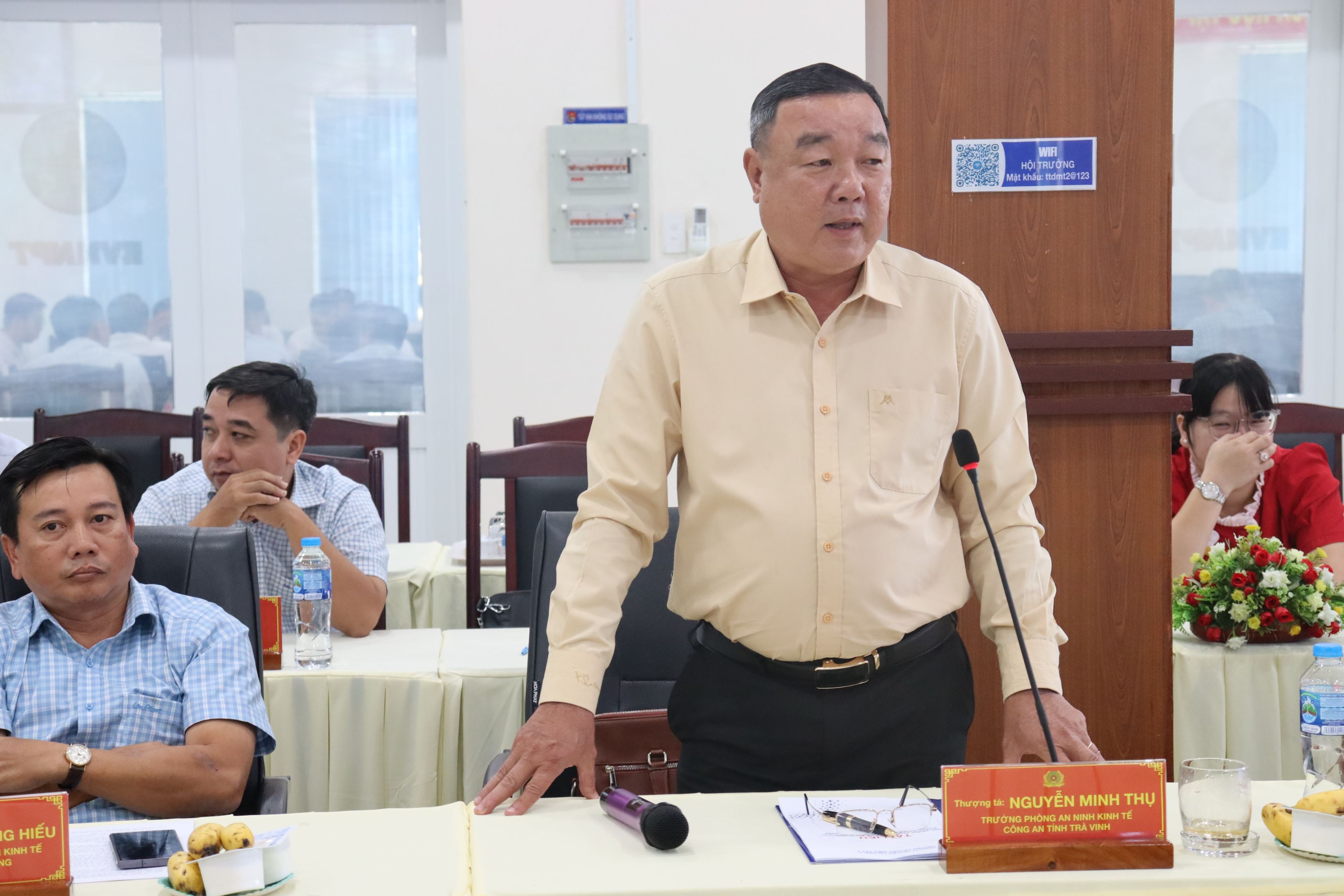 Đồng chí Thượng tá Nguyễn Minh Thụ - Trưởng phòng An ninh Kinh tế, Công an tỉnh Trà Vinh phát biểu tại hội nghị.