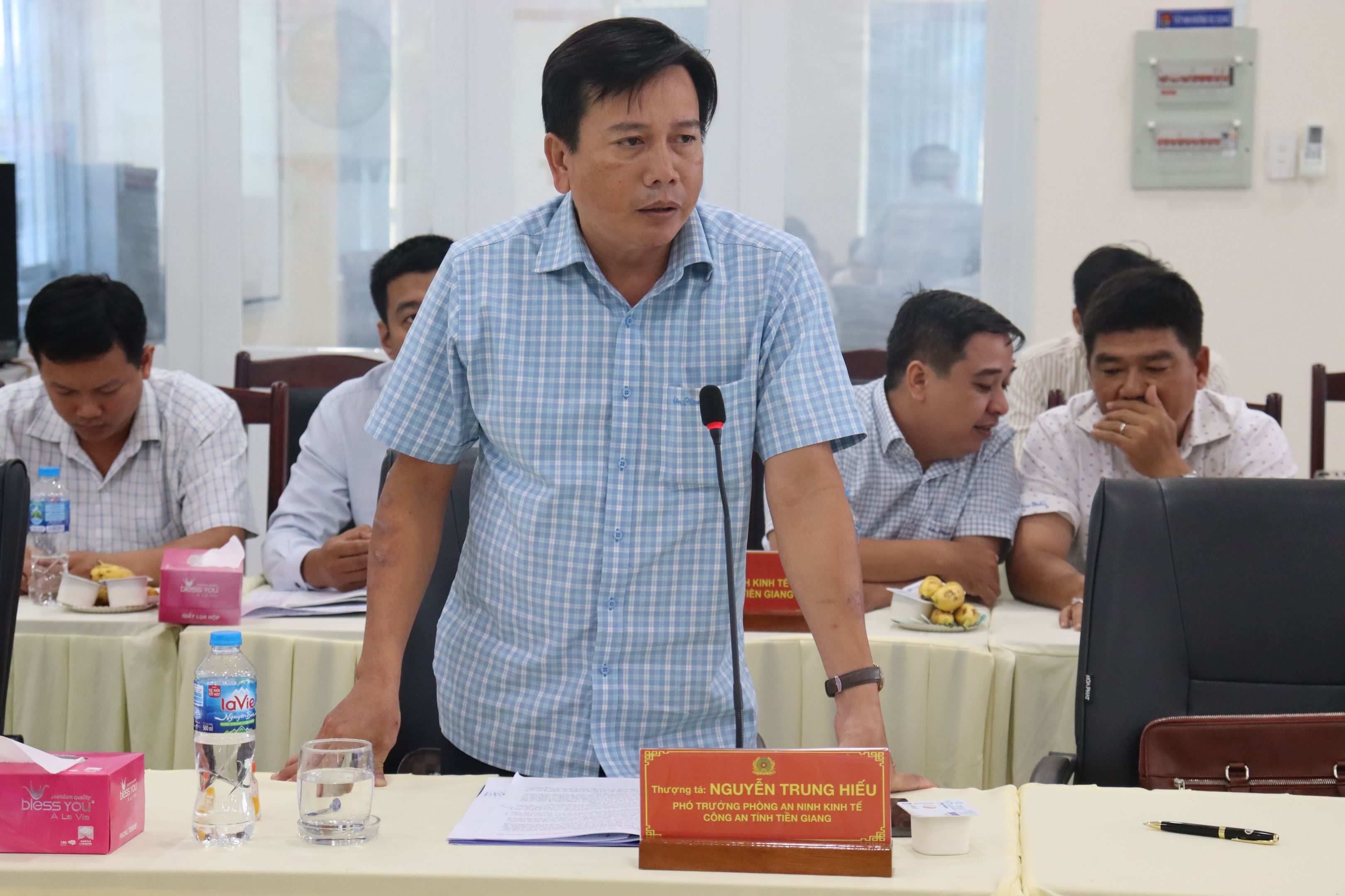 Đồng chí Thượng tá Nguyễn Trung Hiếu – Phó trưởng phòng An ninh Kinh tế, Công an tỉnh Tiền Giang phát biểu tại hội nghị.