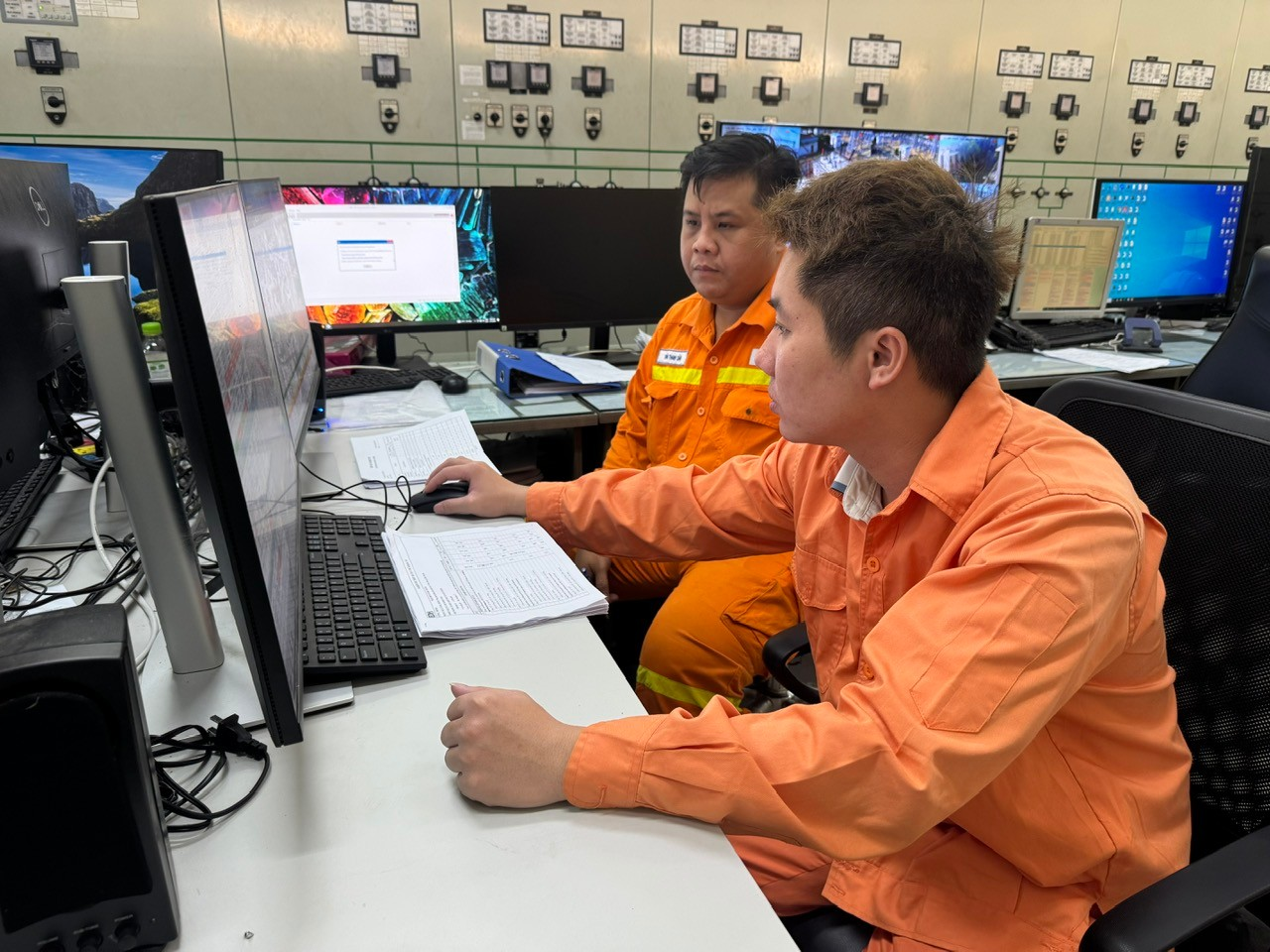 Ảnh: Nhân viên vận hành trạm 220kV Nhà Bè (người mặc áo cam sọc vàng) phối hợp, giám sát nghiệm thu Point to Point hệ thống điều khiển, rơ le bảo vệ ngăn lộ 274 tại màn hình HMI với nhân viên công ty EDH