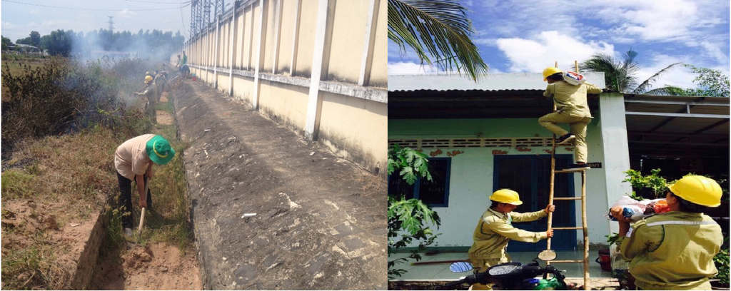 Tập thể CBCNV Trạm 220kv Xuân Lộc chằn néo mái nhà, nạo vét mương, thông cống thoát nước và các công trình phụ.